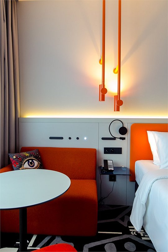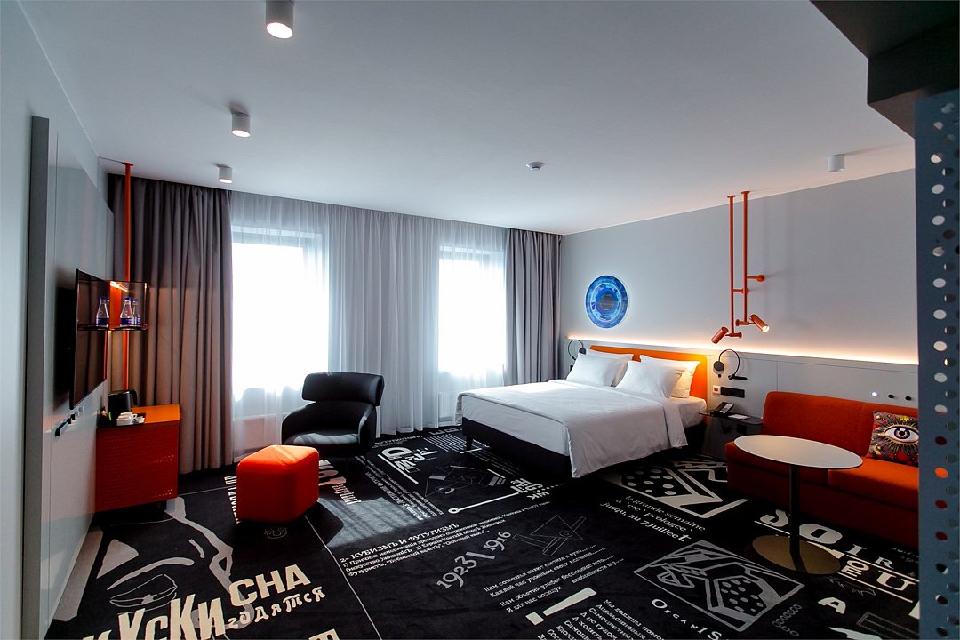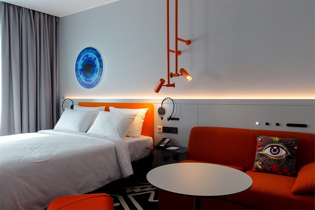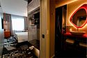 интерактивное телевидение, Wi-Fi, светильник, фен, электронные замки, душевая кабина, банные полотенца, гигиенические средства, косметические средства, двуспальная кровать, вешалки, зеркало, звуконепроницаемые стены и окна, сейф, унитаз, раковина, гостиная зона, ковровое покрытие, вид на город, кресло, стаканы, столовые приборы, туалетный столик, раскладной диван, внутренний телефон, телевизор с плоским экраном, мини-холодильник, номер для некурящих, фанкойл, USB-порт, пуфик, фитнес-зона, чайная станция, двуспальный раскладной диван-кровать, услуги прачечной (платно), вешалки-плечики, бутилированная вода, мини-бар (платно), мыло, затемняющая штора, открытый шкаф, дождевой и ручной душ, можно с питомцамиВ гостиничном номере