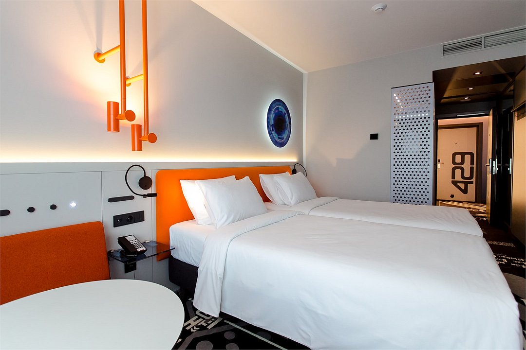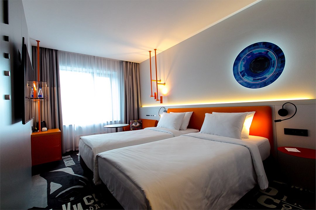 интерактивное телевидение, Wi-Fi, IP-телефон, светильник, фен, электронные замки, душевая кабина, банные полотенца, гигиенические средства, косметические средства, две односпальные кровати, вешалки, журнальный столик, зеркало, звуконепроницаемые стены и окна, обслуживание номеров, унитаз, раковина, ковровое покрытие, вид на город, кресло, стаканы, столовые приборы, тумба, телевизор с плоским экраном, мини-холодильник, номер для некурящих, фанкойл, USB-порт, пуфик, фитнес-зона, чайная станция, услуги прачечной (платно), вешалки-плечики, бутилированная вода, мини-бар (платно), мыло, затемняющая штора, зеркало в полный рост, открытый шкаф, дождевой и ручной душ, можно с питомцамиВ гостиничном номере