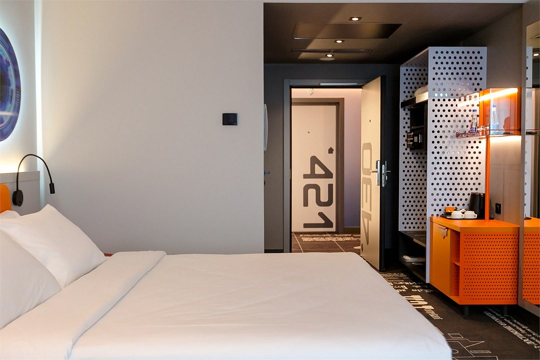 интерактивное телевидение, Wi-Fi, IP-телефон, светильник, фен, электронные замки, душевая кабина, банные полотенца, гигиенические средства, косметические средства, двуспальная кровать, вешалки, журнальный столик, зеркало, звуконепроницаемые стены и окна, унитаз, раковина, ковровое покрытие, вид на город, кресло, стаканы, столовые приборы, тумба, мини-холодильник, телевизор со Smart TV, номер для некурящих, фанкойл, USB-порт, пуфик, фитнес-зона, чайная станция, услуги прачечной (платно), вешалки-плечики, бутилированная вода, мини-бар (платно), мыло, затемняющая штора, зеркало в полный рост, открытый шкаф, дождевой и ручной душ, можно с питомцамиВ гостиничном номере