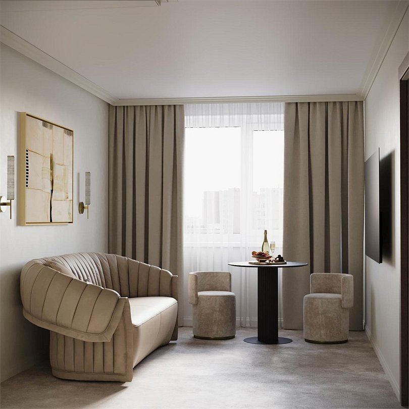 Дизайнерский номер площадью 52м2 повышенной комфортности и улучшенной планировки с гостиной и спальней. Оснащен широкой двуспальной кроватью и удобным диваном, который является дополнительным спальным местом, туалетной комнатой с душевой кабиной.Услуги и удобства