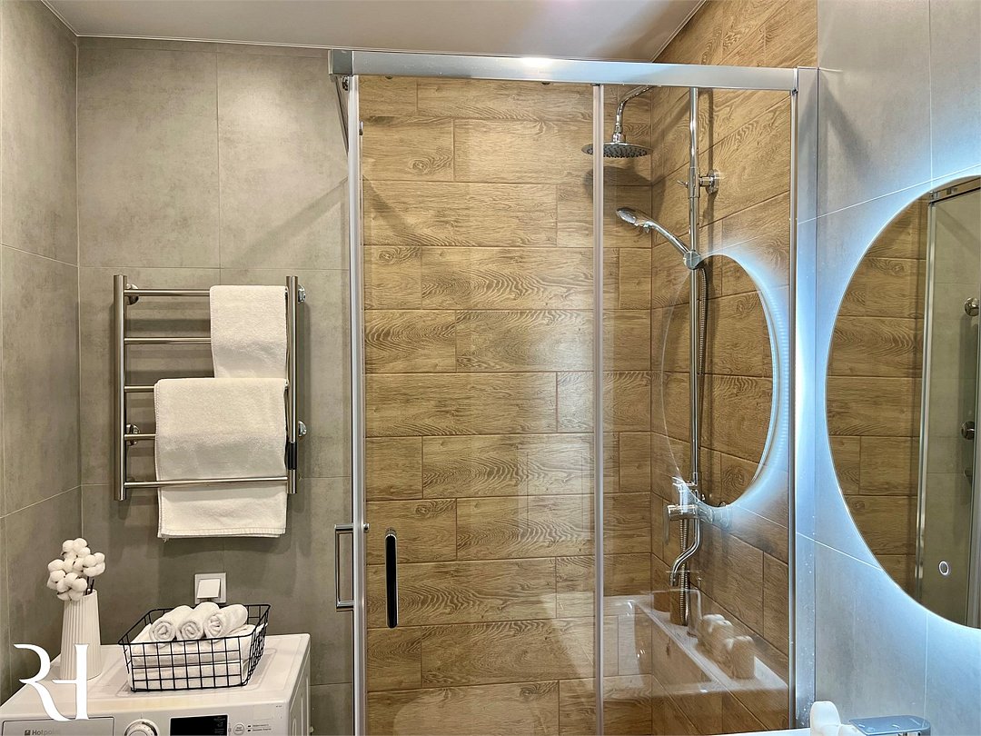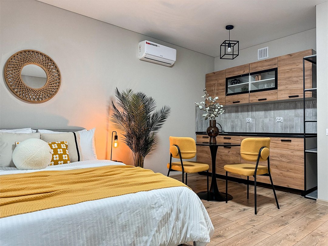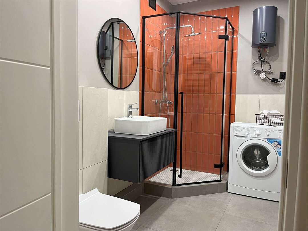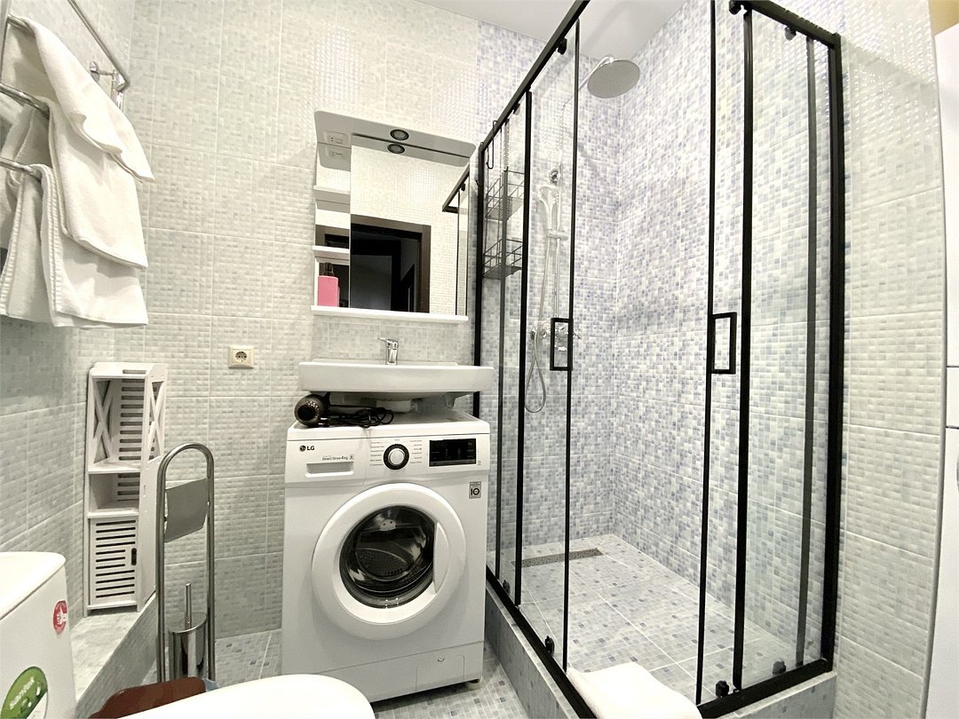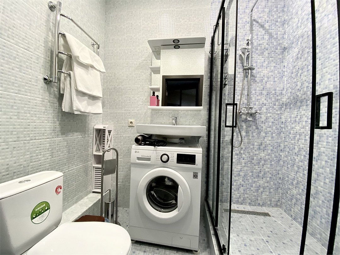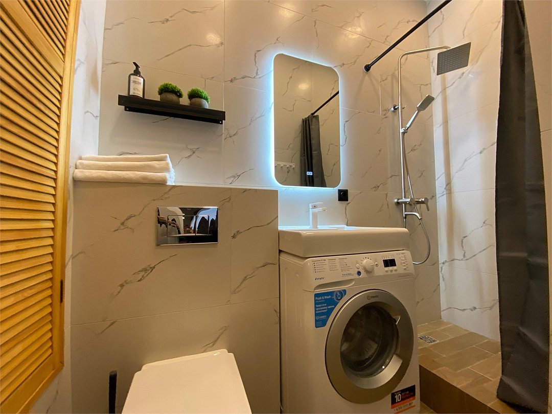 Wi-Fi, холодильник, кондиционер, фен, электронные замки, кофемашина, микроволновая печь, утюг, ванная комната, душевая кабина, водонагреватель, банные полотенца, тапочки, двуспальная кровать, гладильная доска, стулья, шкаф для одежды, вешалки, обеденный стол, зеркало, мебельный гарнитур, кухня, чайный набор, набор посуды, стиральная машина, чайник, унитаз, раковина, отопление, вид на город, вид во двор, кухонная посуда, столовые приборы, стул, туалетные средства, сушилка для белья, телевизор с плоским экраном, рабочий стол, духовка, набор для приготовления чая и кофе, вешалки-плечики, мылоВ апартаментах
