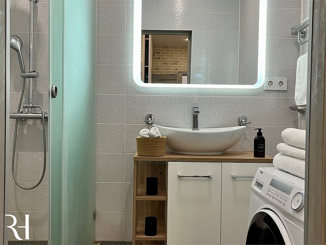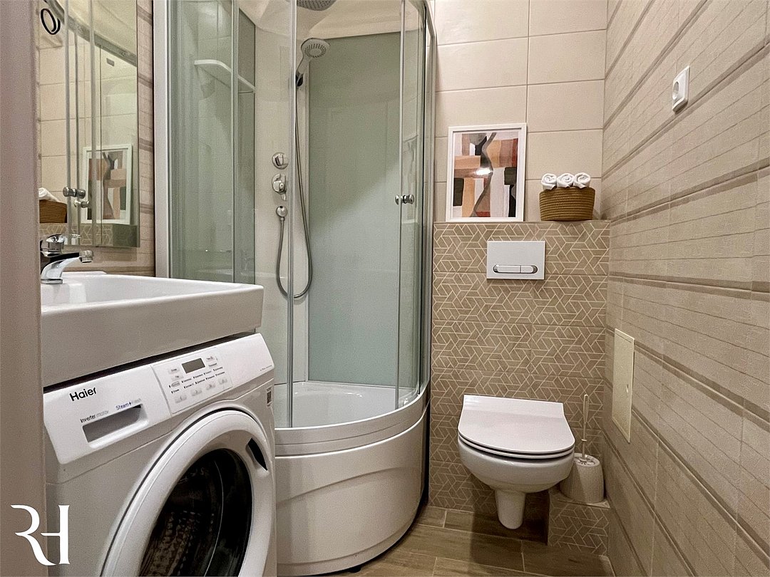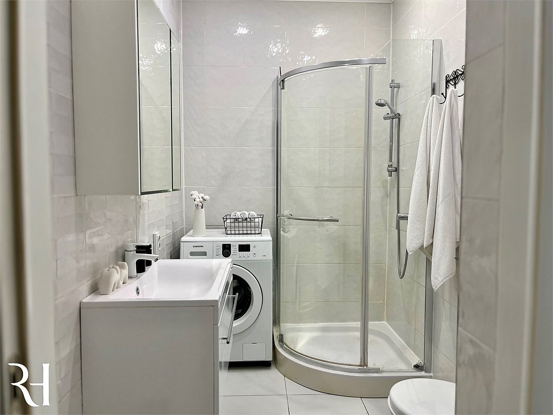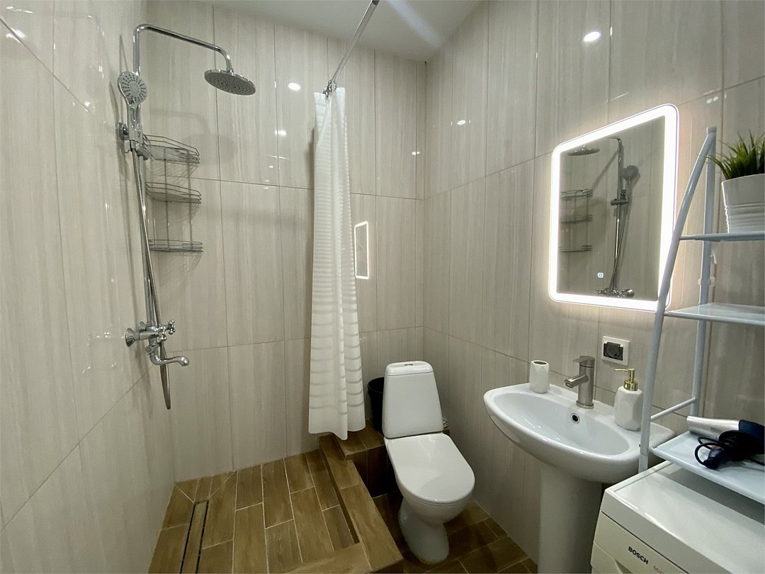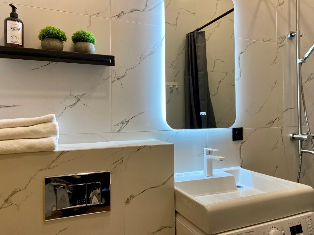 Wi-Fi, холодильник, кондиционер, фен, электронные замки, кофемашина, микроволновая печь, утюг, ванная комната, душевая кабина, водонагреватель, банные полотенца, тапочки, двуспальная кровать, гладильная доска, стулья, шкаф для одежды, вешалки, обеденный стол, зеркало, мебельный гарнитур, кухня, чайный набор, набор посуды, стиральная машина, чайник, унитаз, раковина, отопление, вид на город, вид во двор, кухонная посуда, столовые приборы, стул, туалетные средства, сушилка для белья, телевизор с плоским экраном, рабочий стол, духовка, набор для приготовления чая и кофе, вешалки-плечики, мылоВ апартаментах