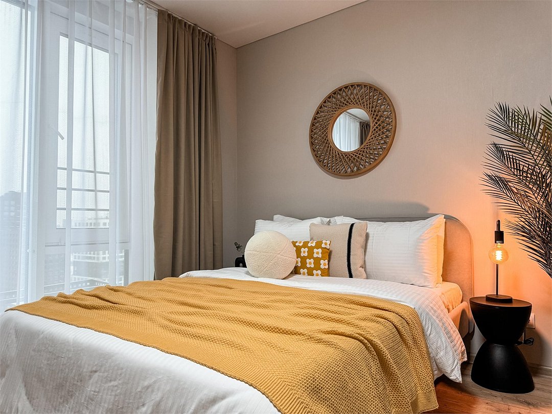 Wi-Fi, холодильник, кондиционер, фен, электронные замки, плита для приготовления пищи, микроволновая печь, утюг, душевая кабина, водонагреватель, банные полотенца, тапочки, косметические средства, двуспальная кровать, гладильная доска, шкаф для одежды, обеденный стол, зеркало, набор посуды, стиральная машина, чайник, унитаз, раковина, отопление, вид на город, стаканы, столовые приборы, стул, туалетные средства, сушилка для белья, телевизор с плоским экраном, кухонный уголок, номер для некурящих, вешалки-плечики, мылоВ квартире