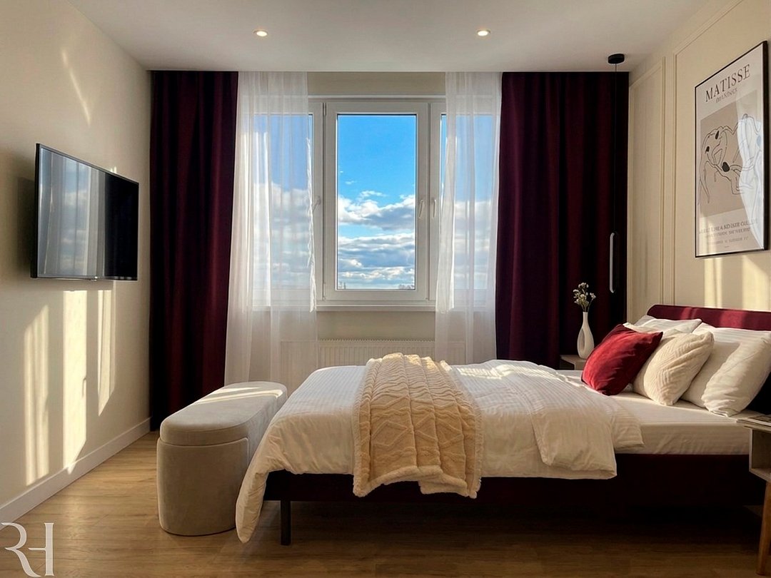 Wi-Fi, интернет, холодильник, кондиционер, фен, электронные замки, плита для приготовления пищи, микроволновая печь, утюг, ванная комната, ванна, банные полотенца, тапочки, косметические средства, балкон, балкон с красивым видом, двуспальная кровать, стулья, шкаф для одежды, обеденный стол, зеркало, унитаз, раковина, вид на город, стул, стол, туалетные средства, телевизор с плоским экраном, шкаф-купе, вешалки-плечики, мылоВ квартире