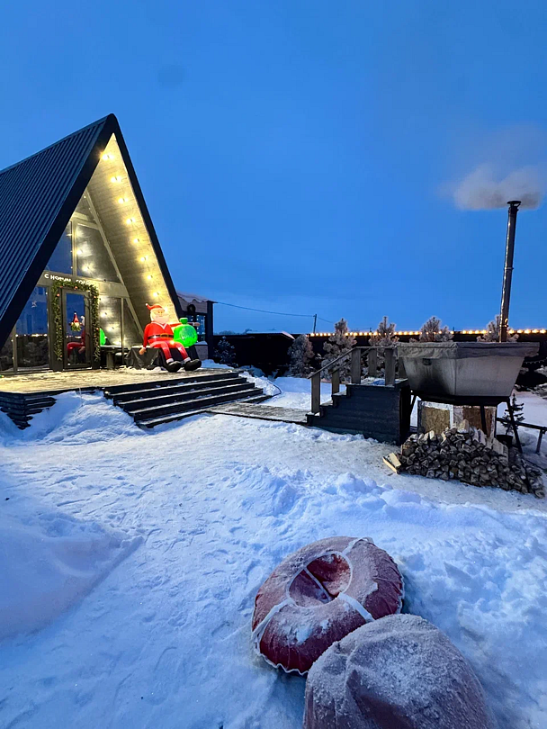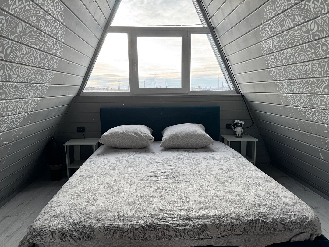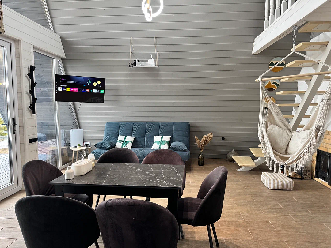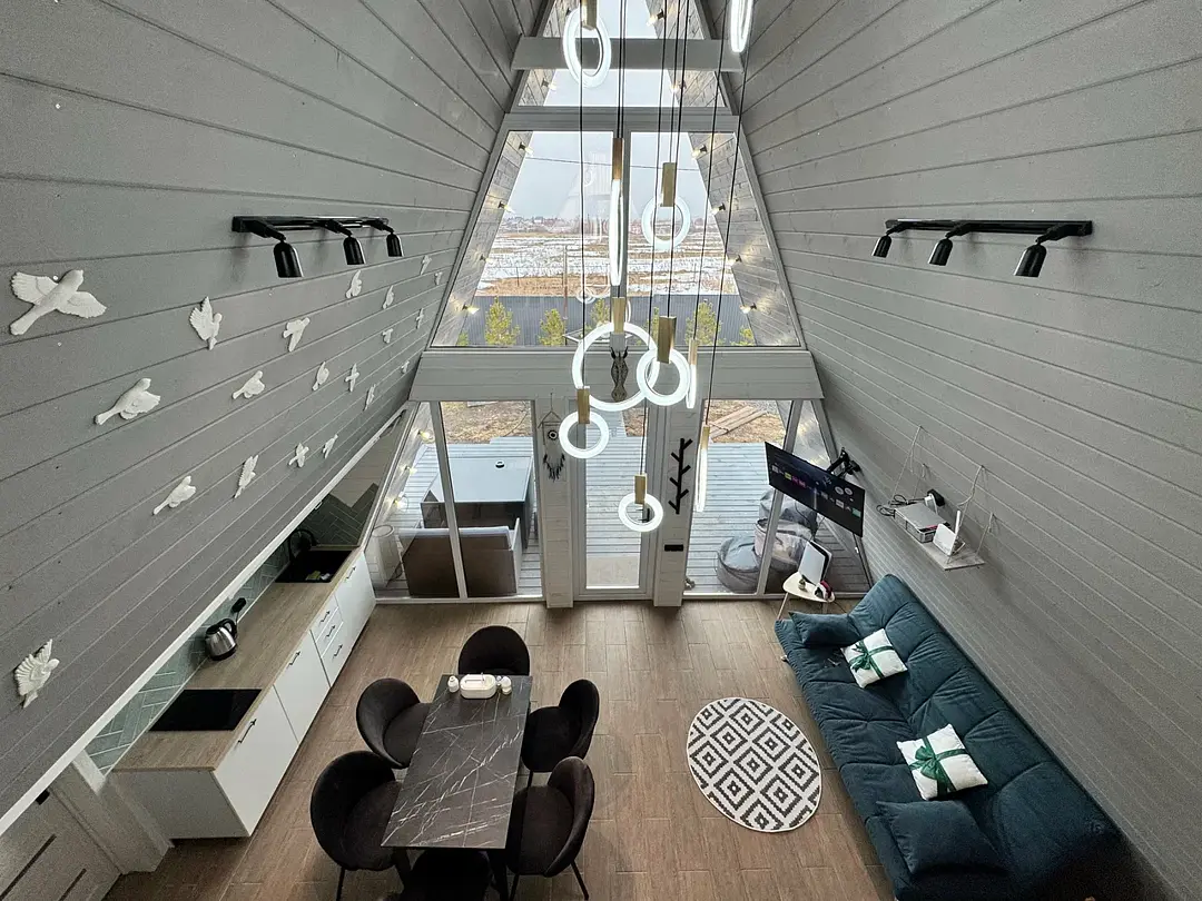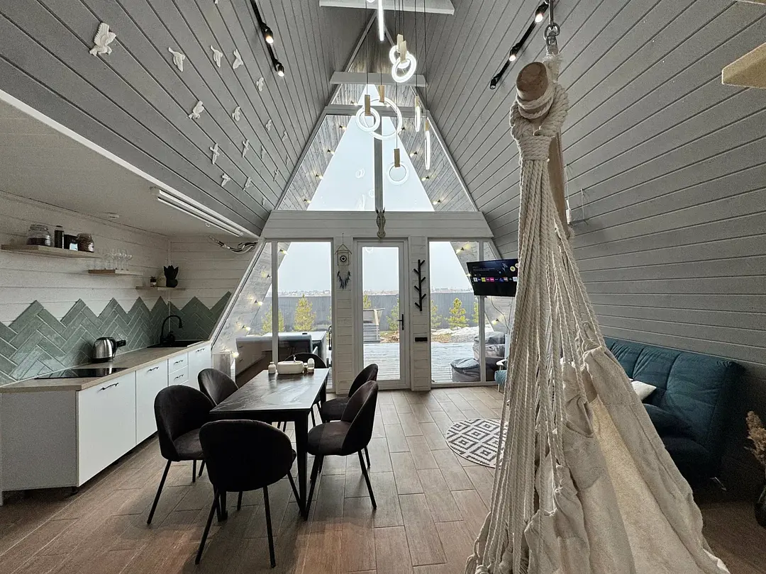 Вас будет ждать уютный двухэтажный А-фрейм вместимостью до 8 человек, полностью обустроенный всем необходимым для комфортного проживания и проведения досуга. В доме установлена удобная мебель, есть телевизор, игровая приставка, кухня и санузел.