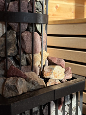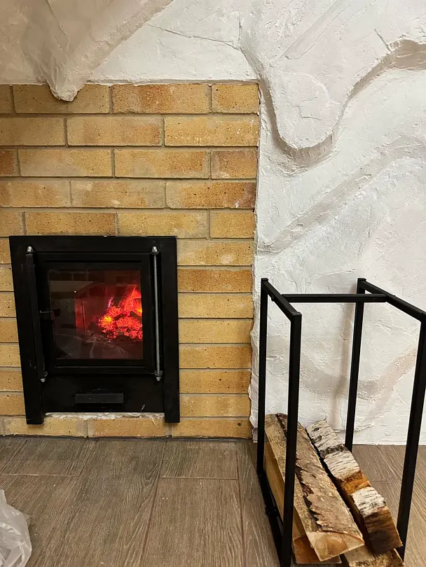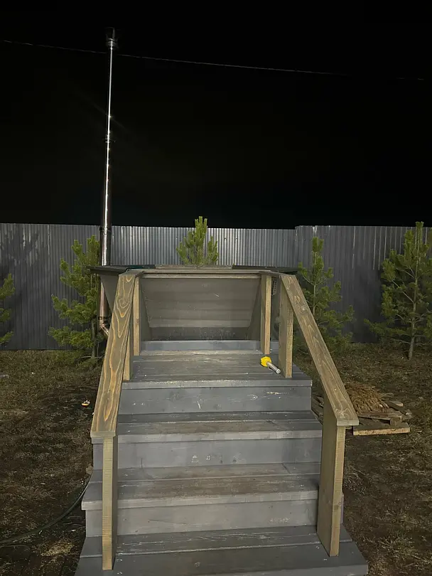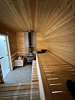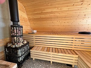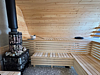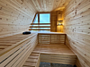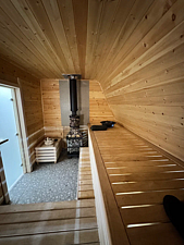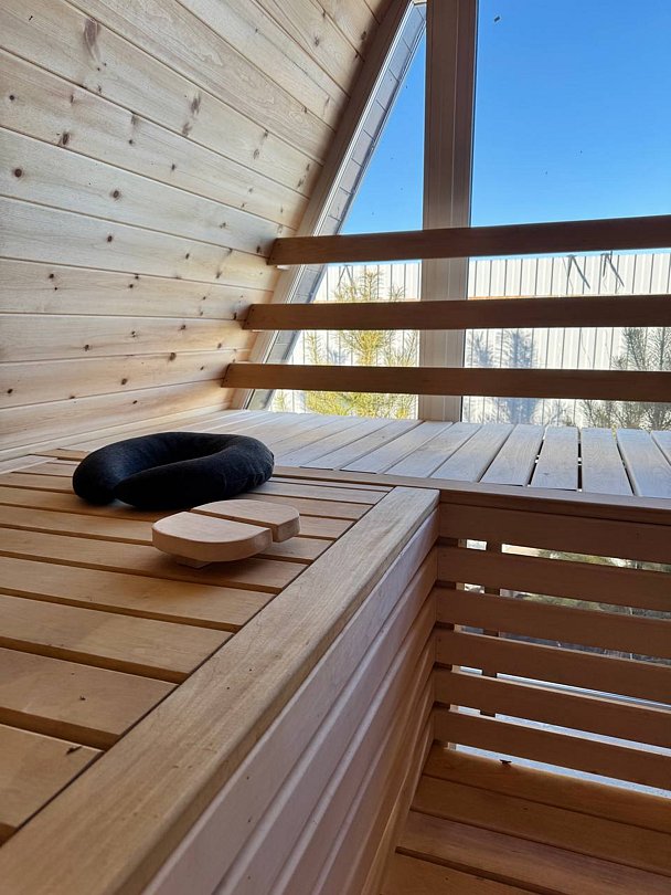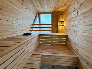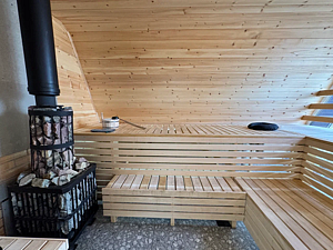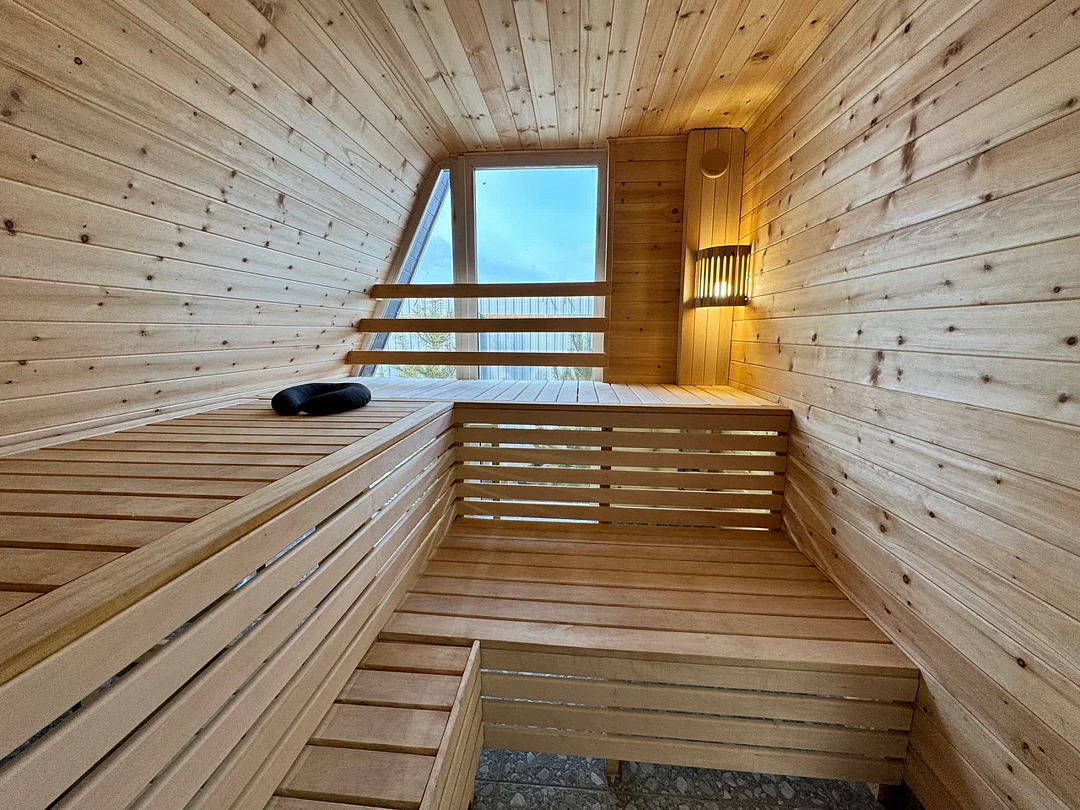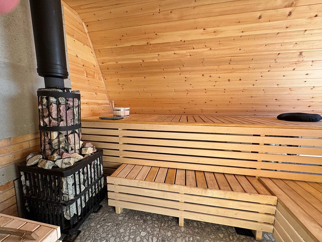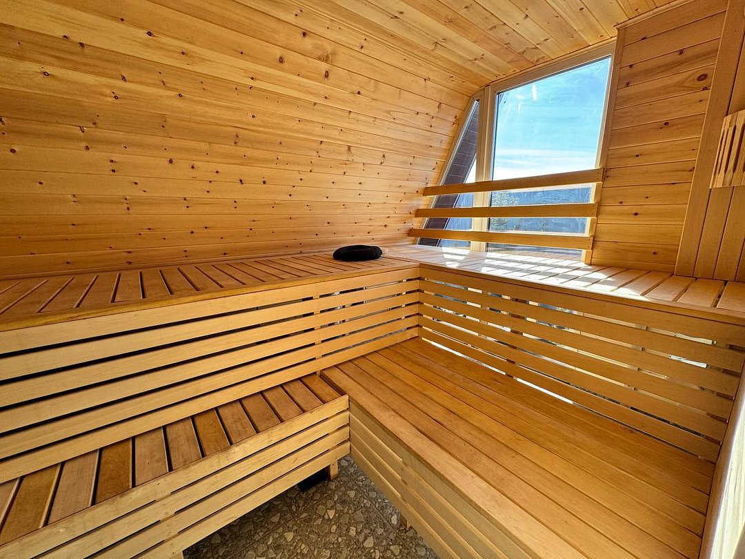 Дровяная печь дарит жар, который прогревает до самых косточек. Уютный интерьер из натурального кедра — идеальное место для релакса. Два уровня полок — выбирай свой комфорт. Большое окно с видом на природу — баня с настроением и светом!