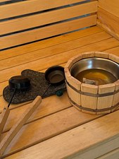 Инфраструктура: шапочки, обливное ведроДровяная печь дарит жар, который прогревает до самых косточек. Уютный интерьер из натурального кедра — идеальное место для релакса. Два уровня полок — выбирай свой комфорт. Большое окно с видом на природу — баня с настроением и светом!