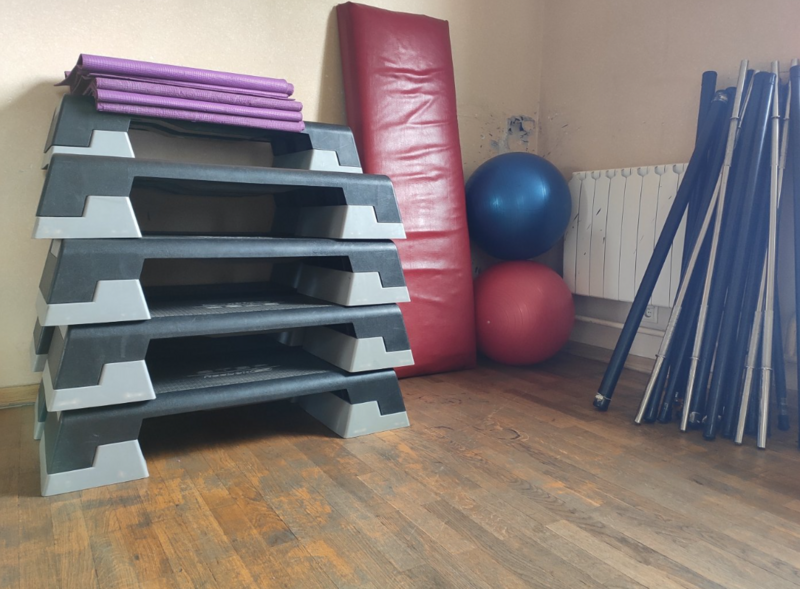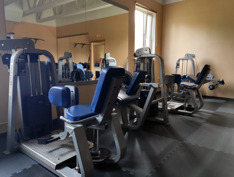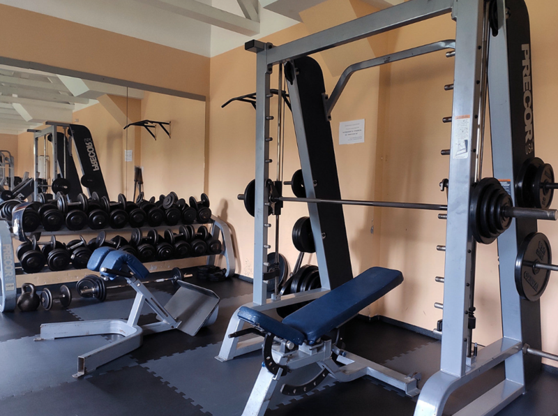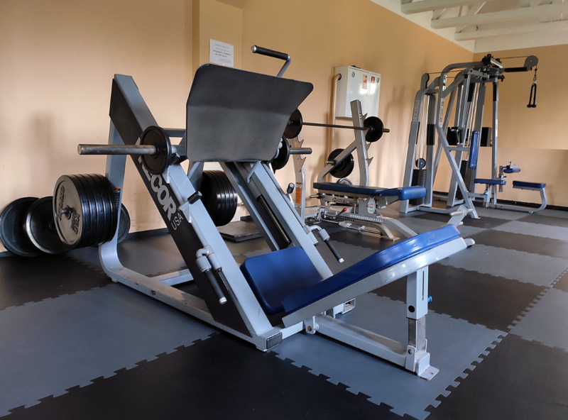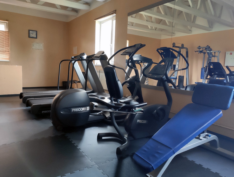 Тренажерный зал оснащен профессиональными тренажерами, такими как «беговая дорожка», «велотренажер», «лыжи» и др.