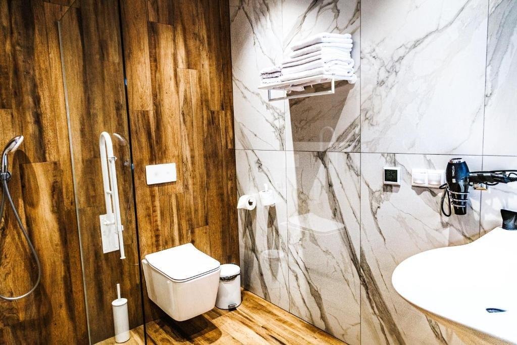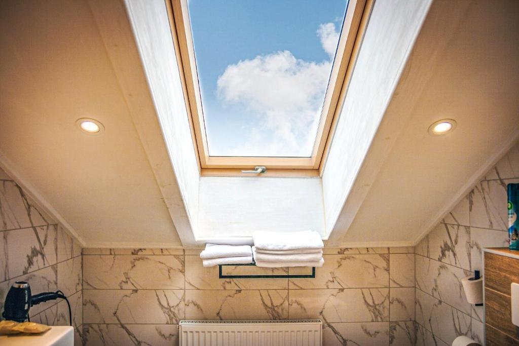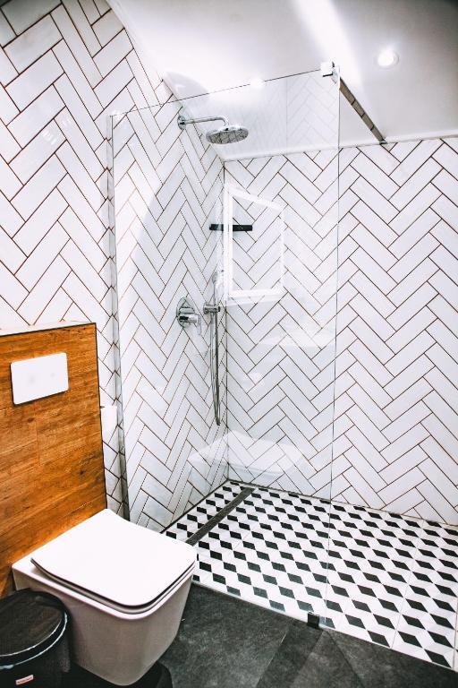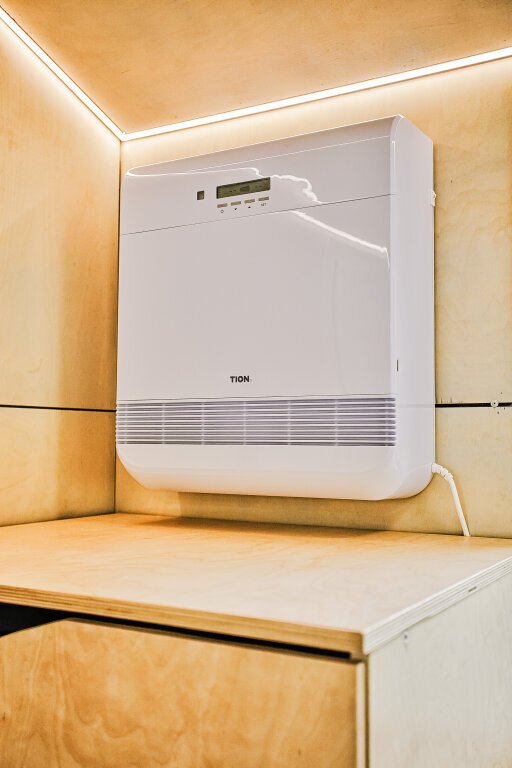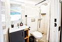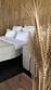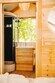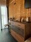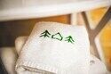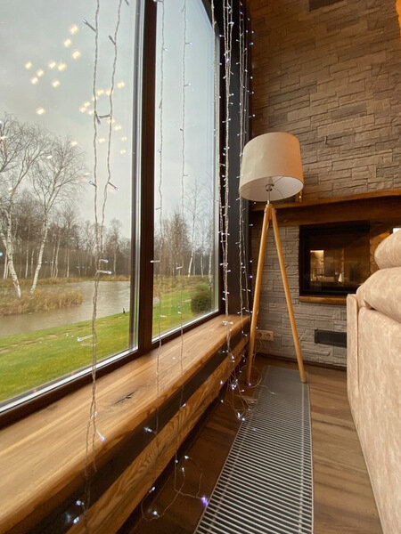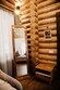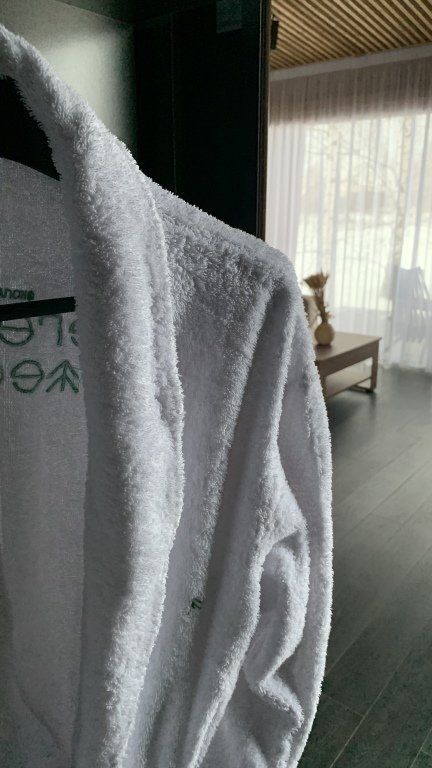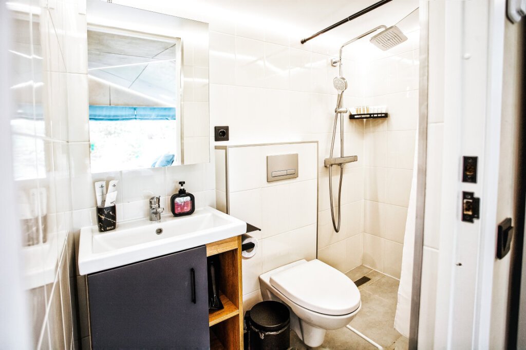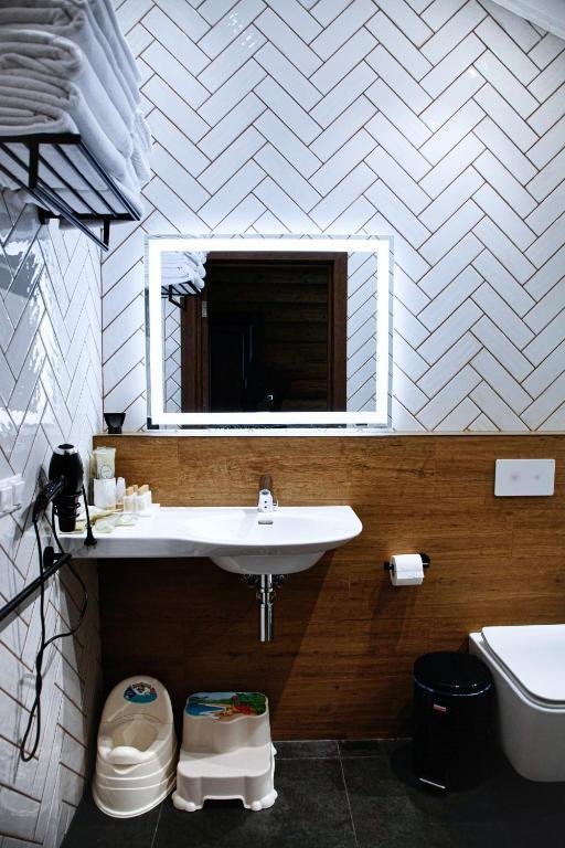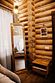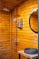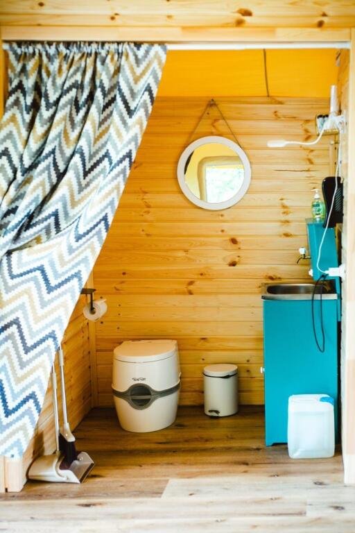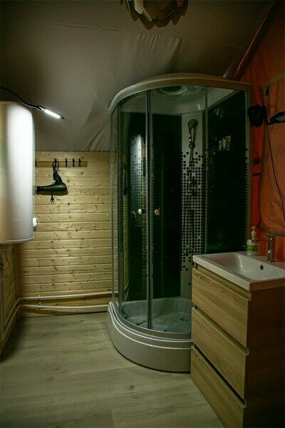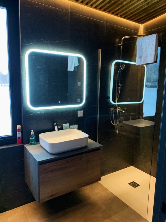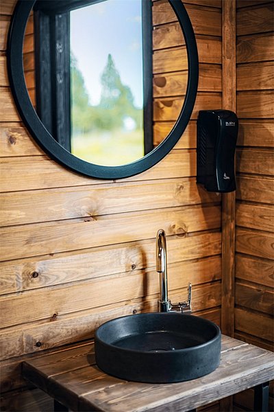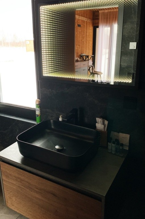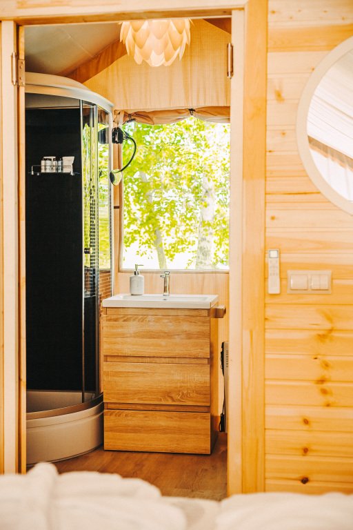 В бунгало установлен полноценный банный модуль с душевой кабиной, раковиной и биотуалетом, есть полотенца и банные халаты. Зеркало с подсветкой и большое окно с красивым видом на лес (разумеется, окно закрывается, обеспечивая, когда нужно, необходимую приватность)