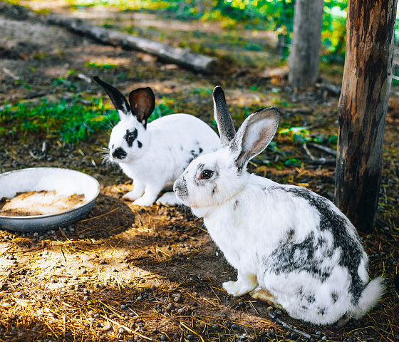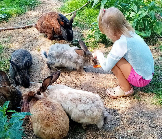 На экоферме можно покормить овец, коз, лошадей, кур и кроликов (пакетик с овощами стоит 100 р). Большинство животных, впрочем, стесняются незнакомых людей и убегают- так, к маленьким поросятам и крольчатам нам