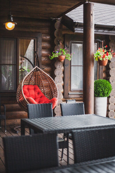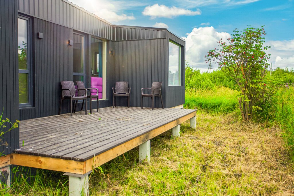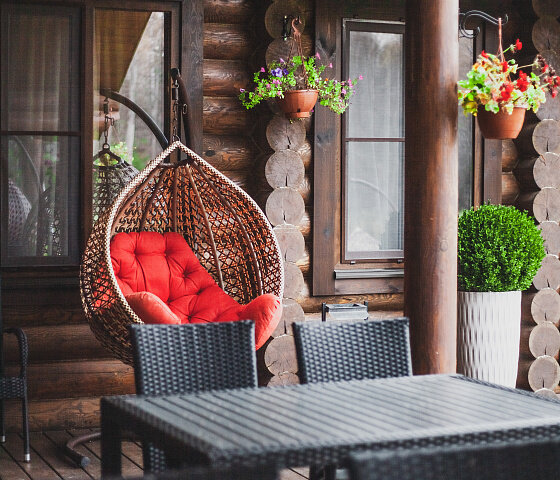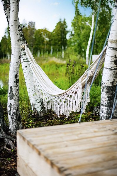 На уютной веранде (она, кстати, закрывается на случай холодной погоды) — шезлонги и столик, возле бунгало висит гамак и установлен мангал.