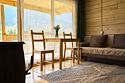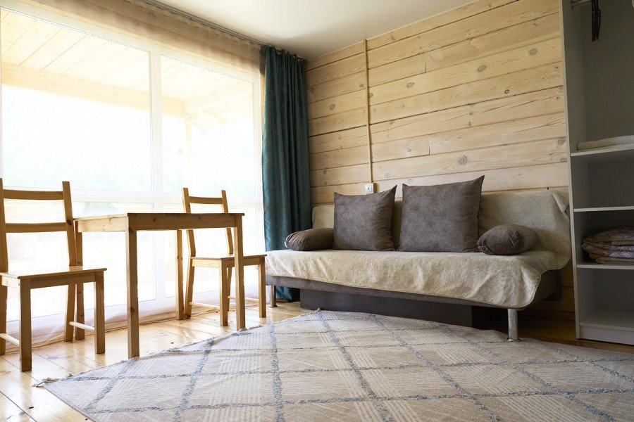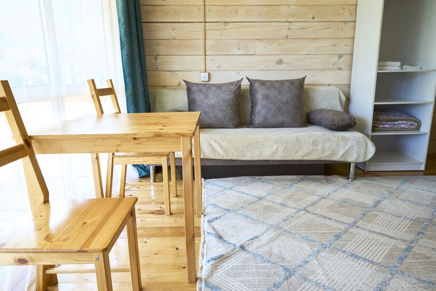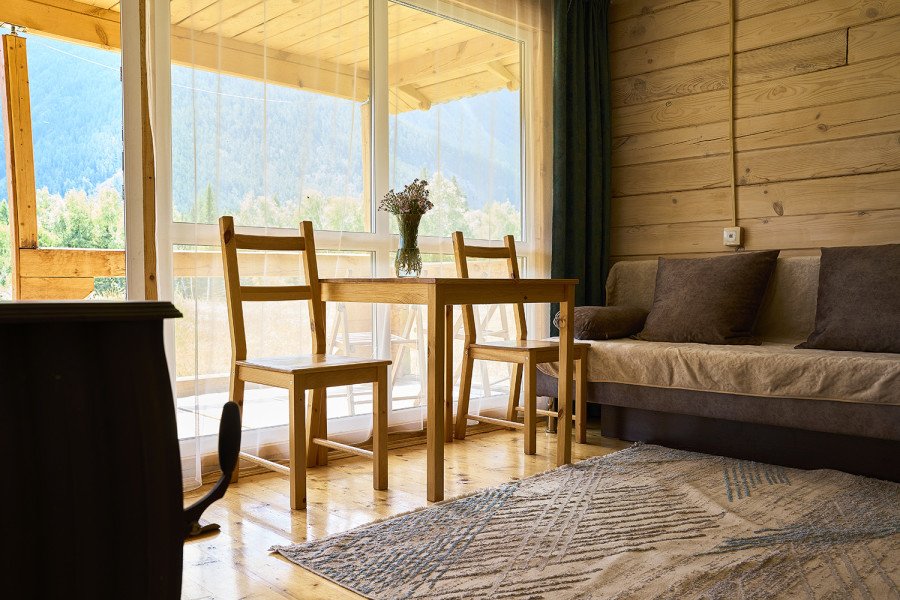 Собственная терраса. Панорамное окно с видом на горы, лес и реку Чуя. Косметика премиум класса, фен. Печь-камин с открытым огнем. Просторная кровать и двухместный диван. Шкаф для вещей. Удобства в номере.