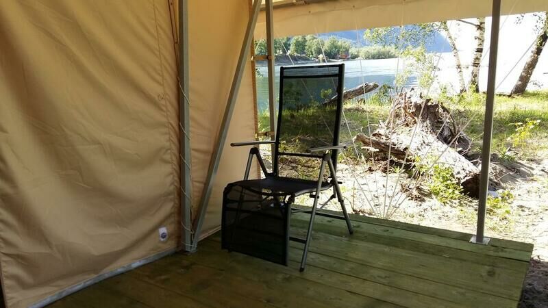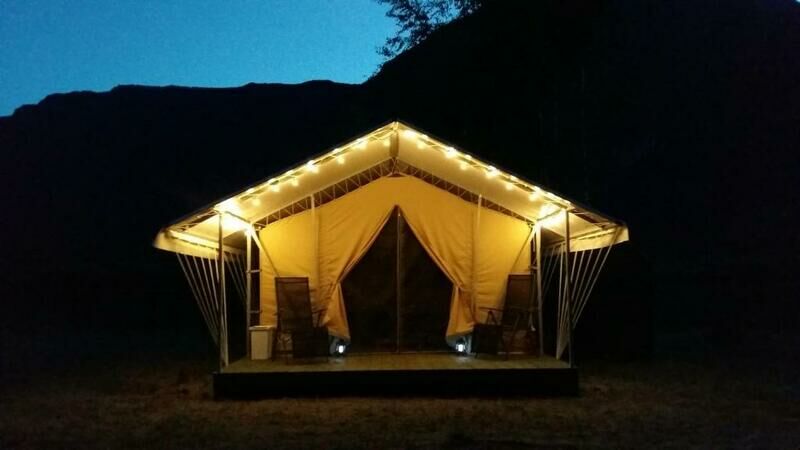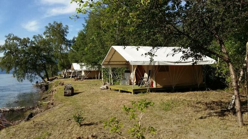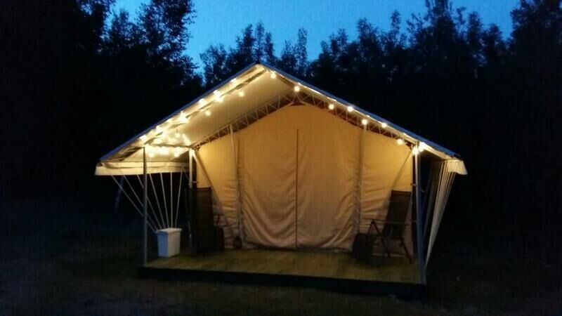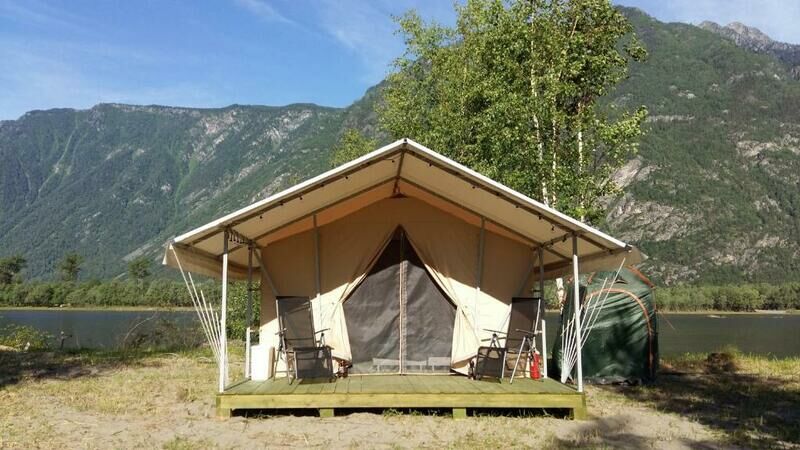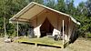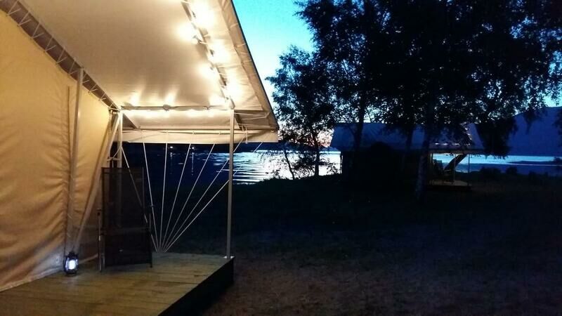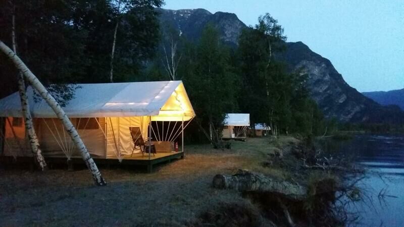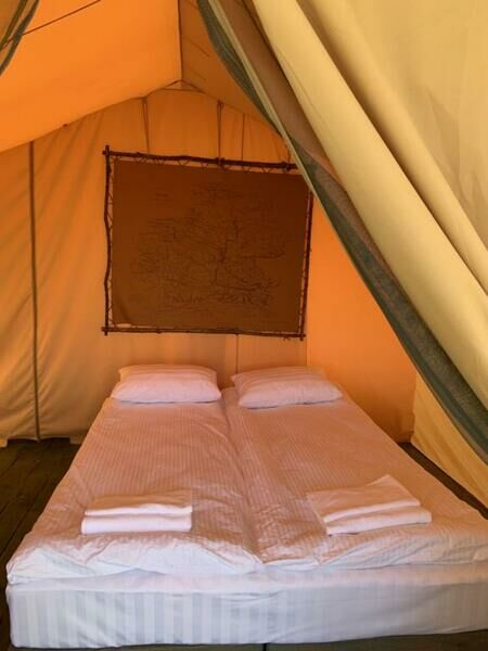 Глэмпинг предлагает размещение в уютных двух- и трехместных шатрах, установленных среди дикой природы. В шатрах есть кровати с удобными матрасами, ларь для хранения вещей, зеркало, душевая с горячей водой, вечером от генератора подается электричество — напряжение рассчитано только на неэнергоемкие приборы. Кроме того, рядом с каждым шатром установлен собственный биотуалет.