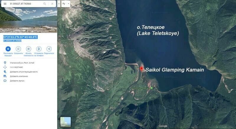 САЙКОЛ ГЛЭМПИНГ КАМАИН находится на острове Камаин, что в дельте реки Чулышман, образованный при впадении ее в Телецкое озеро. Крупнейший остров озера и всей республики Алтай. Добраться до самого острова можно только по воде. Путь из Артыбаша на катере занимает 1,5 часа.