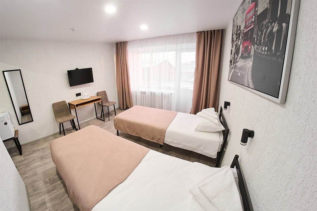 Wi-Fi, холодильник, две односпальные кровати, тумбы, стулья, письменный стол, унитаз, раковина, душ, вид на город, внутренний телефон, телевизор с плоским экраном, зеркало в полный рост, открытый шкафВ гостиничном номере