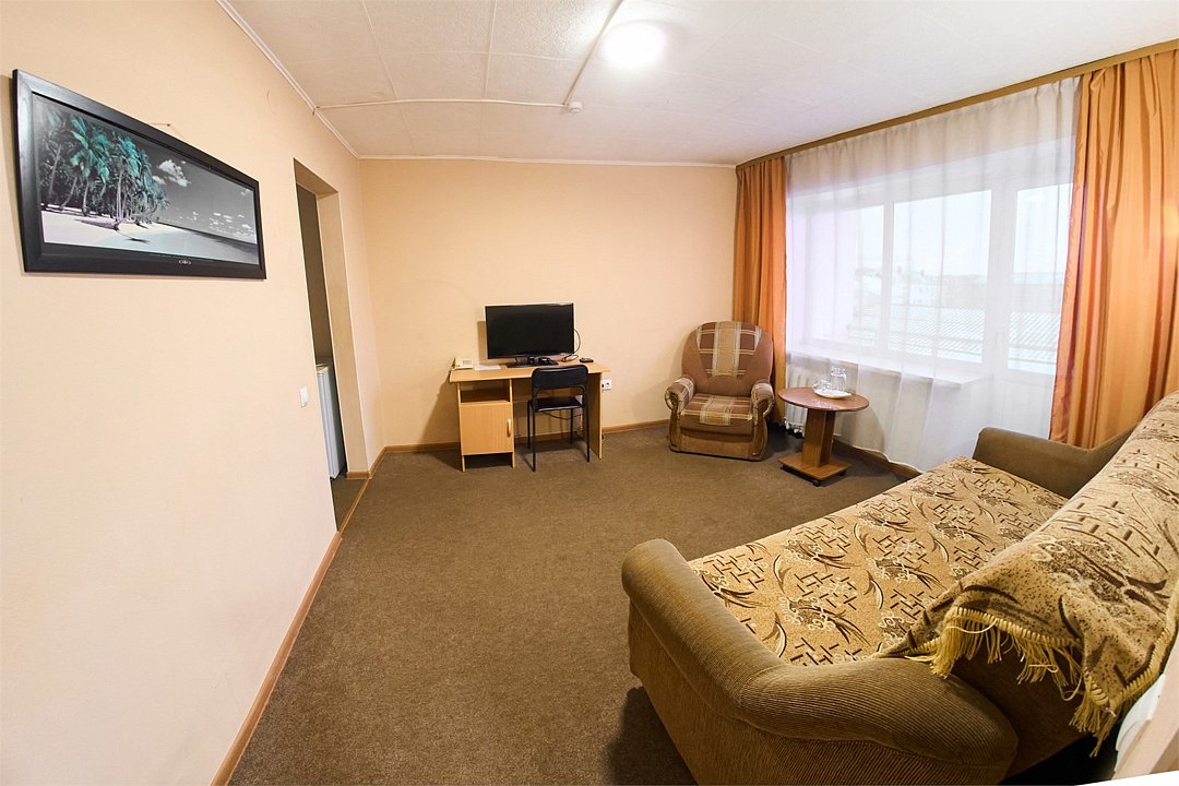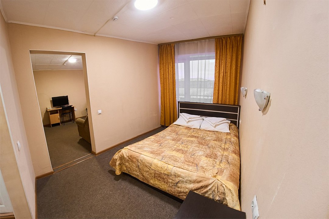 ДВУХКОМНАТНЫЙ НОМЕР КАТЕГОРИИ ЛЮКС Отдельная спальная комната с большой кроватью, удобная гостиная для работы и просмотра интерактивного телевидения, раздельный санузел, душевая кабина с необходимыми туалетными принадлежностями.Услуги и удобства