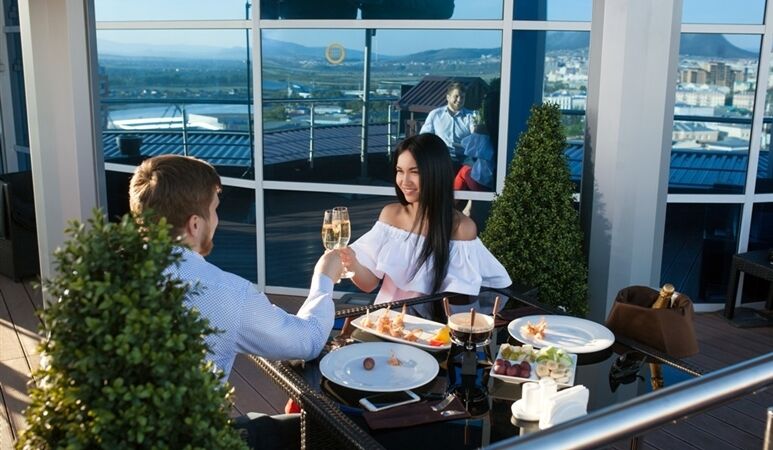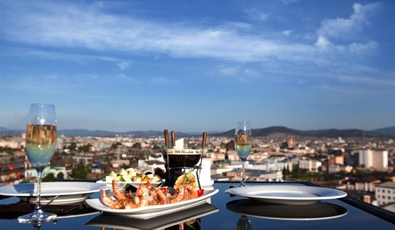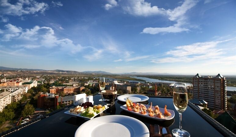 Вокруг стойки «БАРА 12», расположенной в самом центре круглого стеклянного зала, установлена вращающаяся платформа, которая за 30 минут (12 раз в день и 12 раз в ночь) незаметно обернёт Вас и откроет всю окружающую Вас красоту городских пейзажей и холмистые окрестности слияния рек Уда и Селенга. Вы вдруг почувствуете новое незабываемое чувство Победителя - Вы будете неторопливо парить и созерцать просторные безграничные дали!