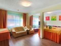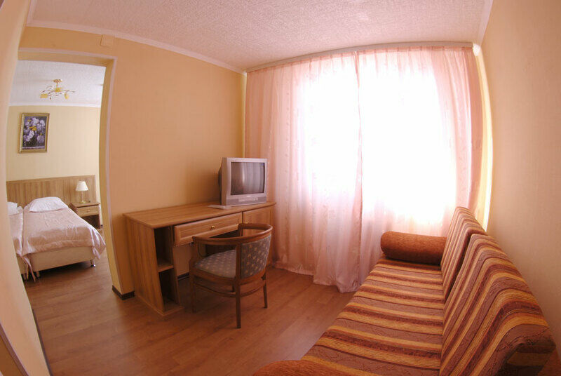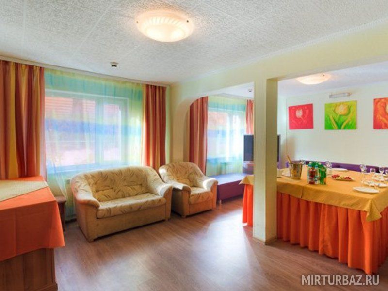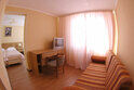 Люкс представляет собой просторный номер с набором мягкой мебели, двуспальной или двумя односпальными кроватями, холодильником, телевизором, санузлом с душевой кабиной, рабочей зоной, Wi-Fi.