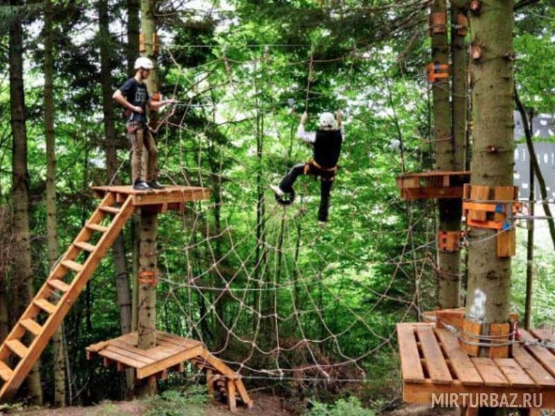 Это новый вид досуга, или экстрим-аттракцион, кому как нравится. Куча тросов, площадок, лесенок и прочих элементов, натянутых на высоте между столбами или деревьями. Дух захватывает, когда покачиваешься на веревках на такой высоте! Высота до 9 метров! Но все абсолютно безопасно, непрерывная система страховки надежна, даже захочешь упасть — не сможешь. Есть экстрим-уровень, на котором не все взрослые доходят до конца. Варианты на любой возраст и уровень подготовки!