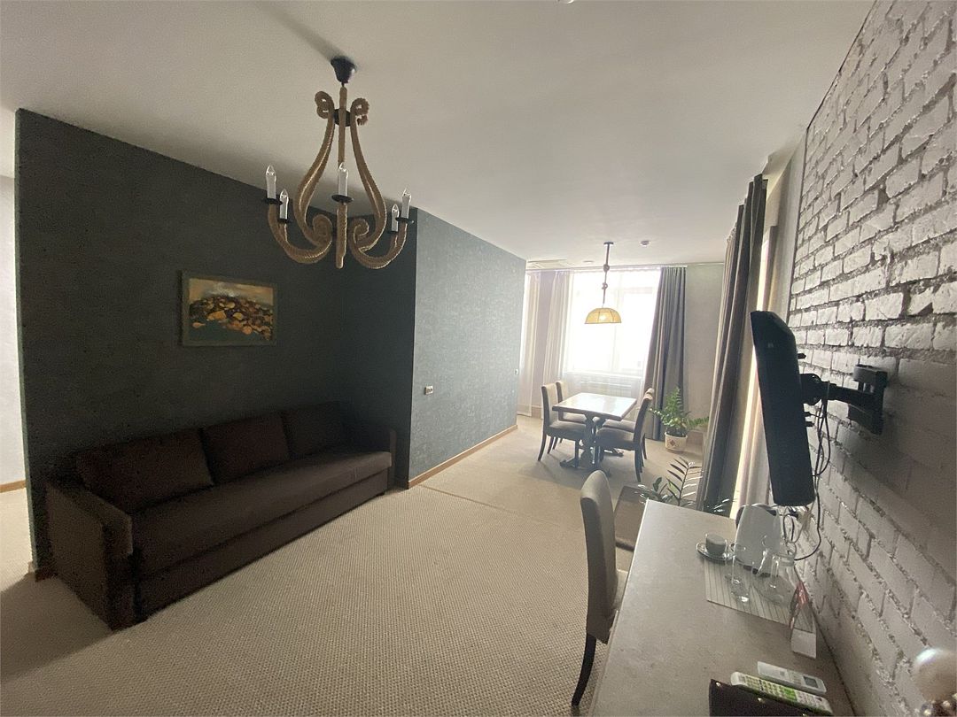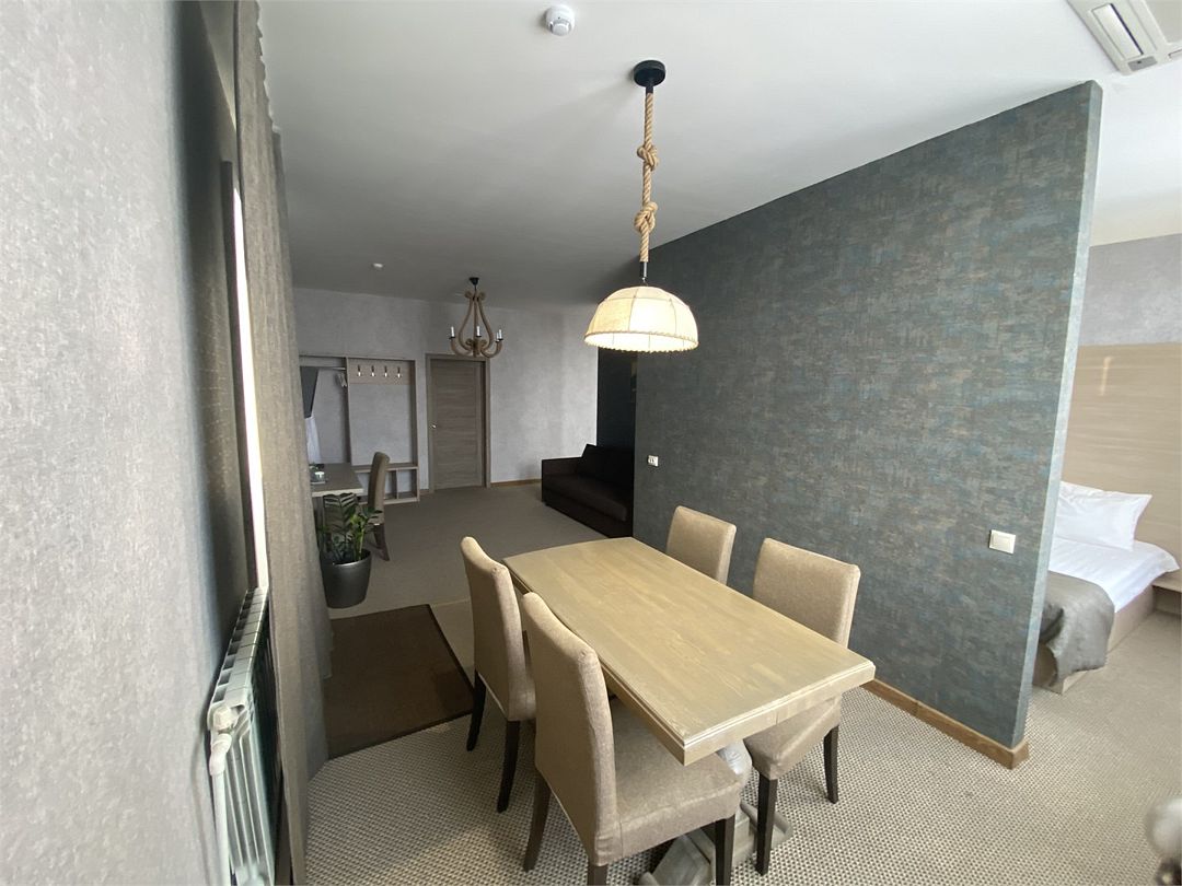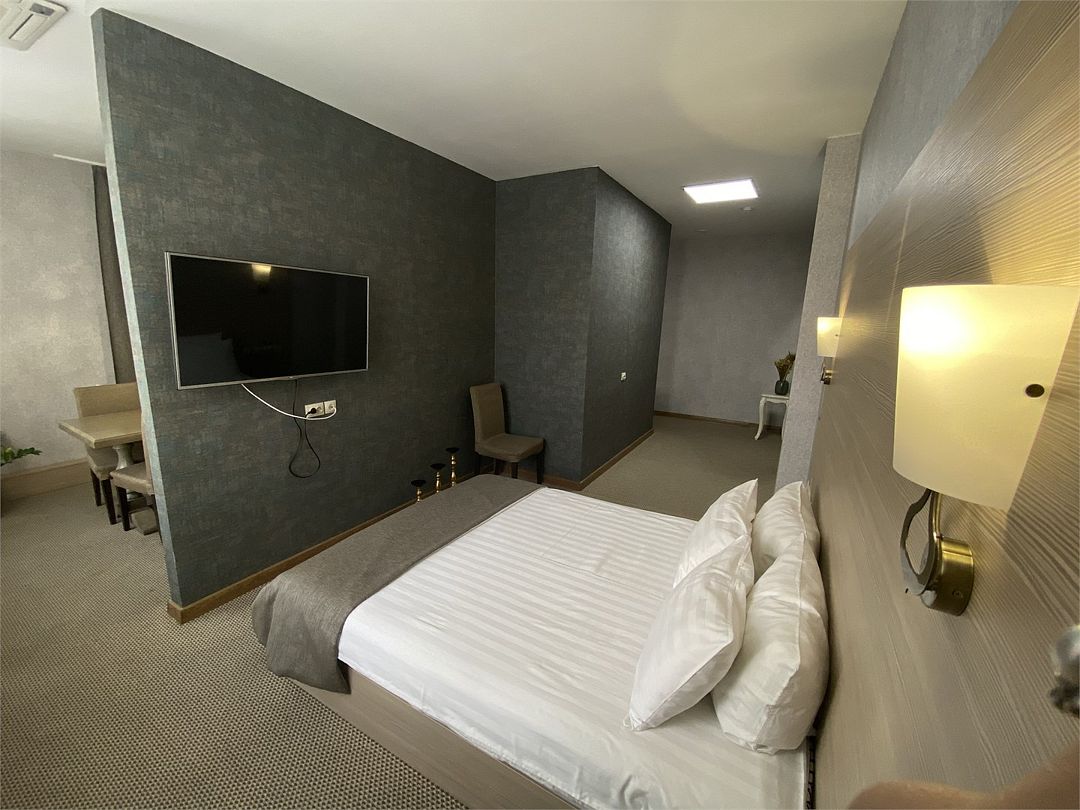 Комфортабельный просторный двухкомнатный номер с 1 кроватью, выделенной рабочей и спальной зонами, ванной комнатой, а также просторной террасой с видом на город. Оснащен телевизором с кабельными каналами, рабочая зона, чайная станция, вода бутилированная, бесплатный wi-fi, сейф, туалетные принадлежности, халаты, полотенца и тапочки.