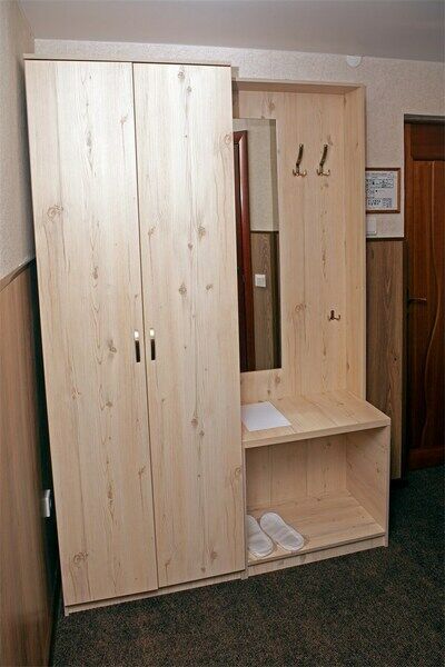 1 полутороспальная кровать, 1 двуспальная кровать стол, тумба, телевизор, душ, санузел, телефон