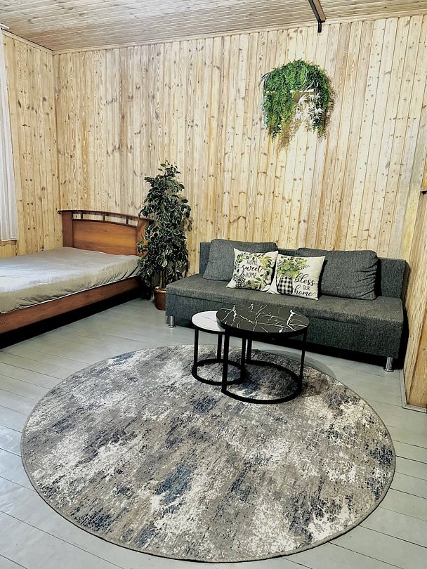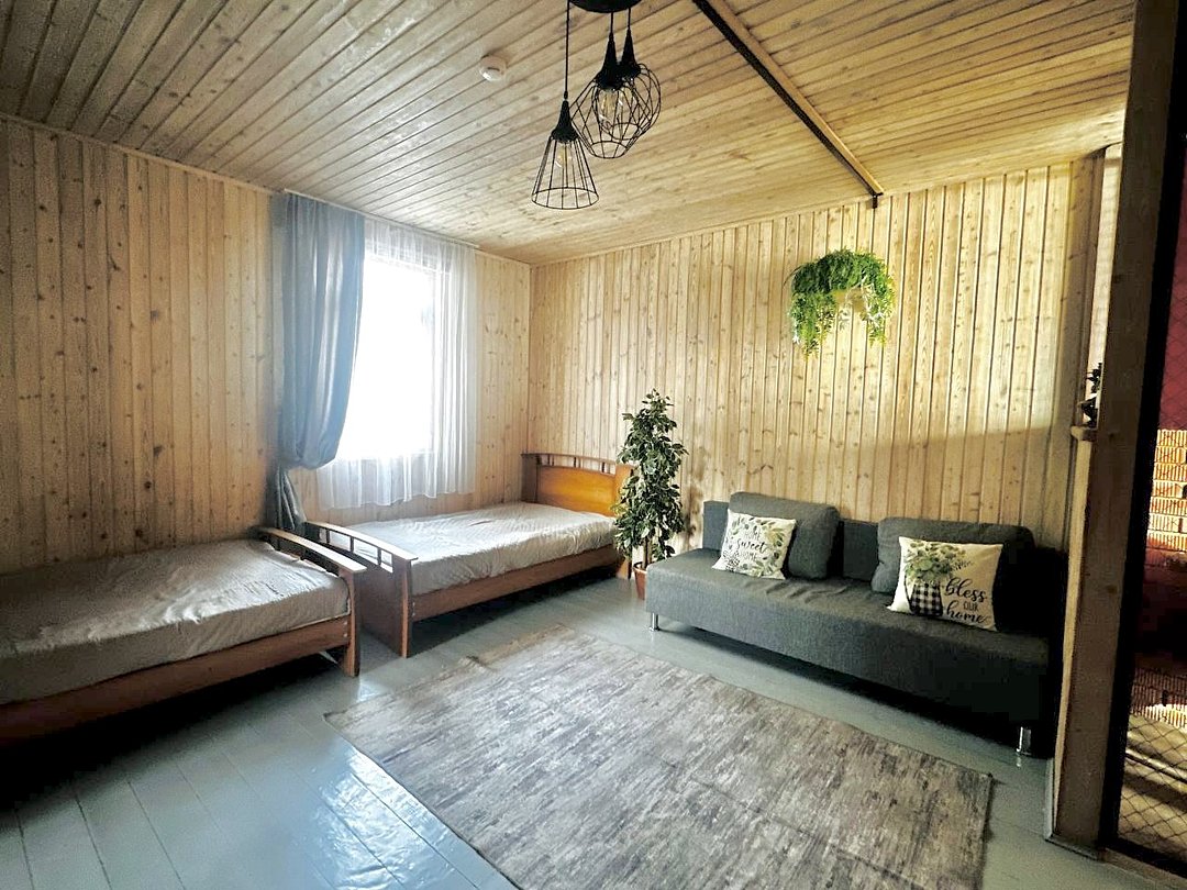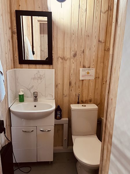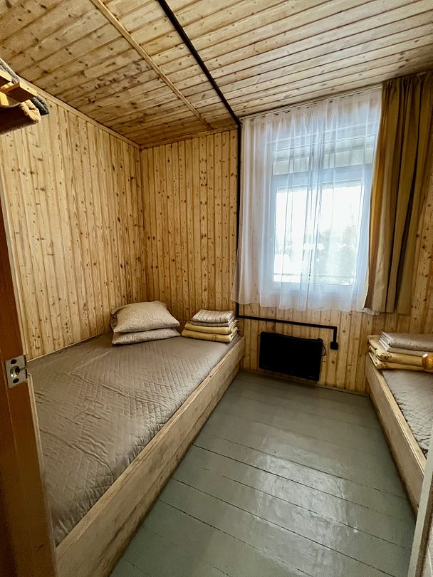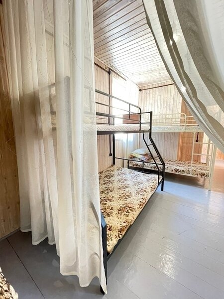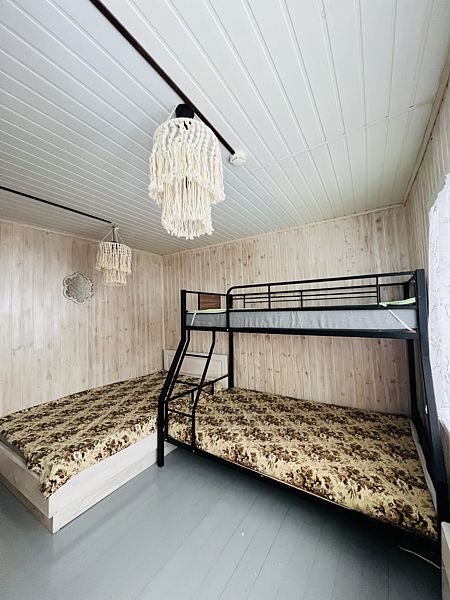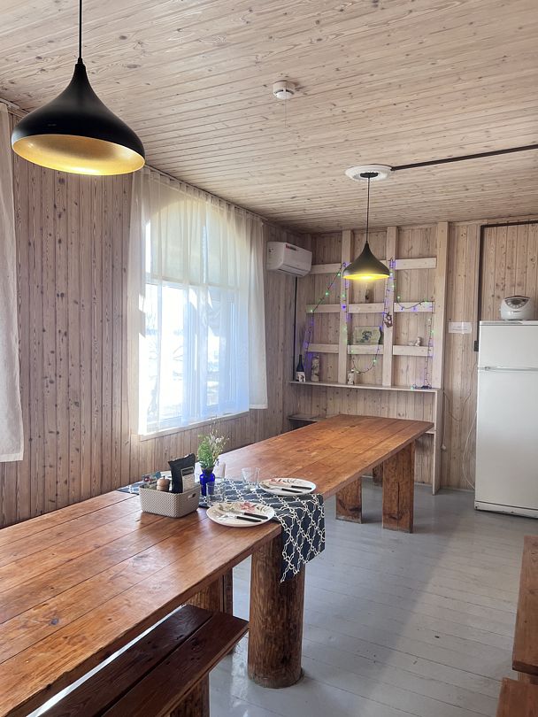 Всего 2 комнаты, большая столовая и общая спальня. Около домика мангал бесплатно. Можно жарить шашлык, приготовить уху и плов. Казан и решетки барбекю можно взять в аренду. В доме туалет с раковиной, душ и унитаз.
