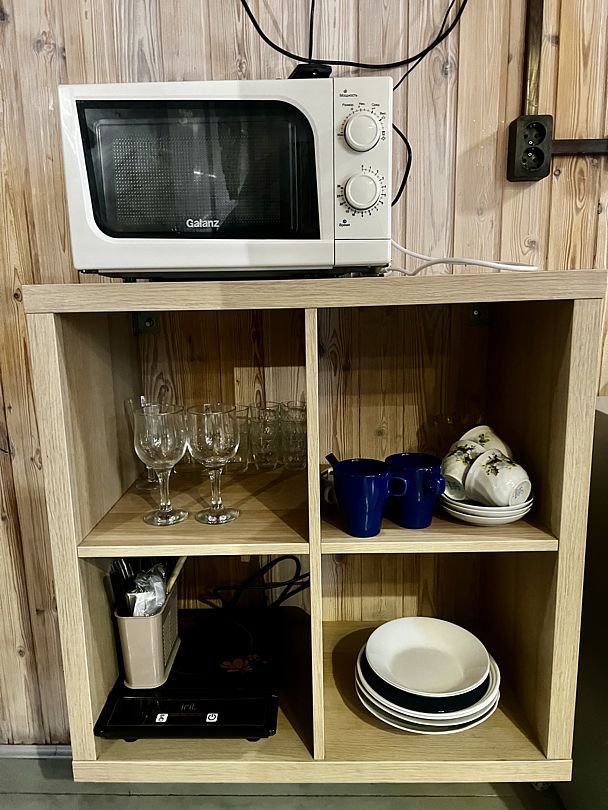 - В номере : кондиционер, СВЧ, мини холодильник , ТВ , чайник, посуда , столовые приборы, тостер, электрическая плитка. Утюг и гладильная доска по запросу бесплатно. Детская кроватка и стульчик для кормления бесплатно по запросу.