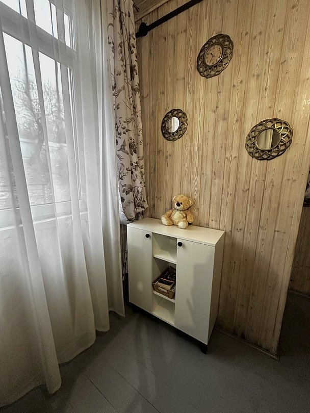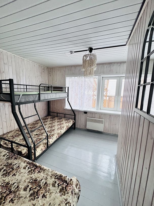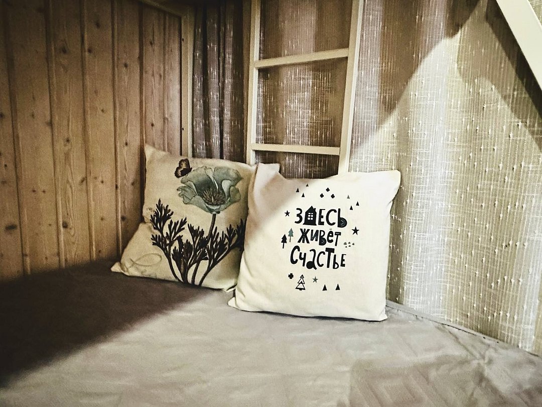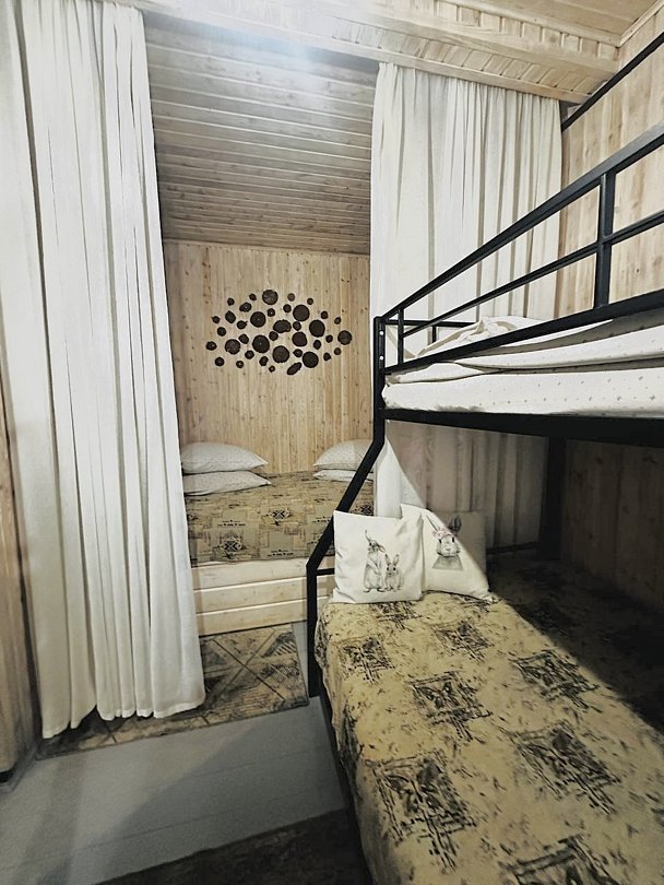 НедостаткиРасположение кроватей в доме , не очень комфортно всем спать лицом в одну кучу, а ногами не получится, т.к. изголовье двухствольной кровати спрятано за двухъярусной