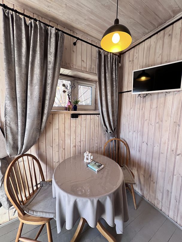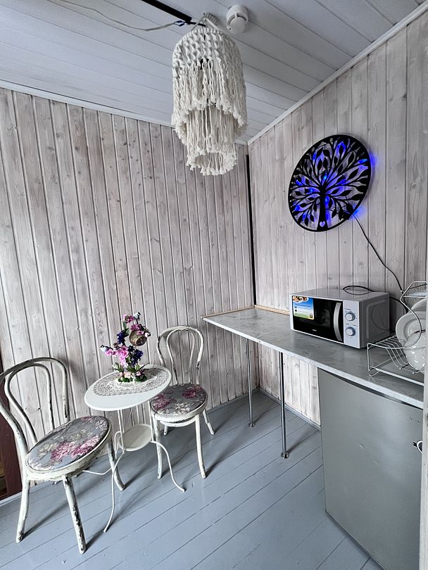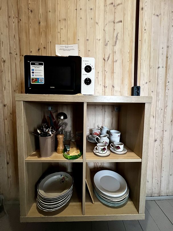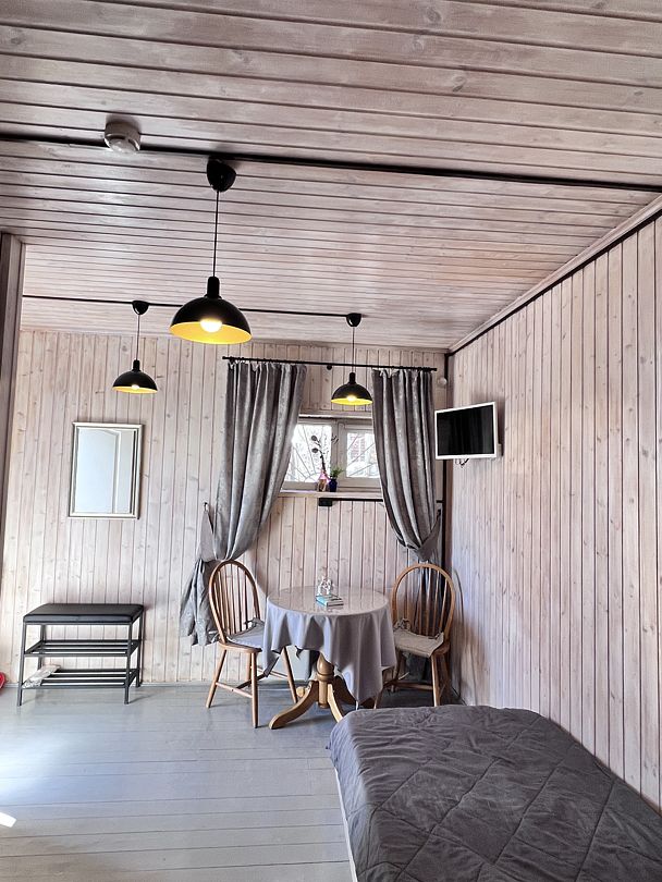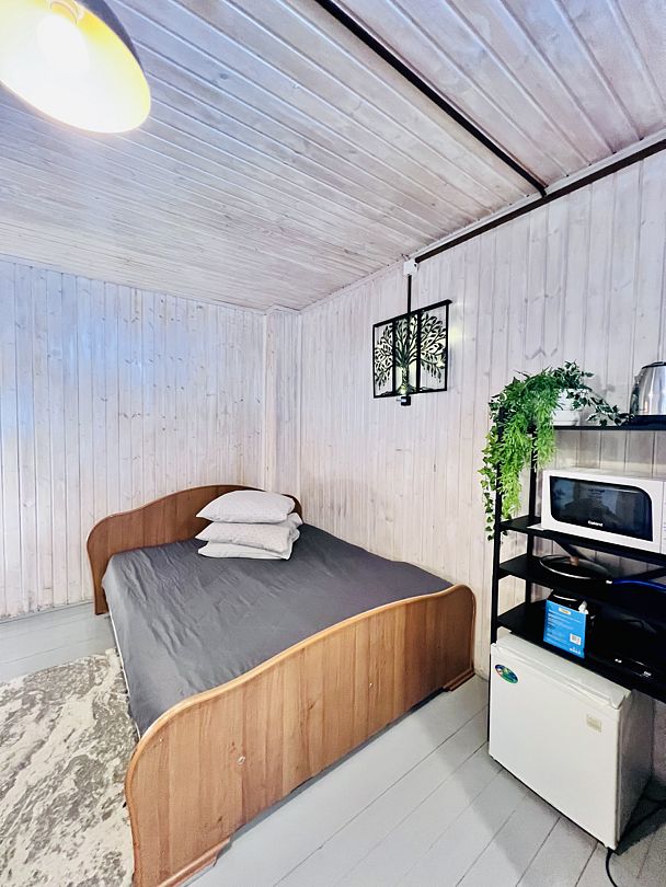 В номере : СВЧ, мини холодильник, ТВ, чайник, посуда , столовые приборы, электроплитка, тостер. Утюг и гладильная доска по запросу бесплатно. Гостям предоставляется постельное белье, полотенца, гель для душа. Номер расположен на 1 этаже. Рядом настоящая русская баня на дровах с вениками и кедровый банный чан с травами (за дополнительную плату). Удобный мангал и зона отдыха на улице перед домиком. Охраняемая закрытая территория, комфорт и безопасность.