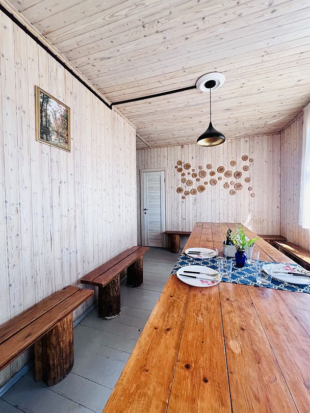 Перед домом зона кострища и беседка с мангалом. В доме просторная столовая, спальная комната, санузел с душем, унитазом и раковиной. Рядом расположена настоящая баня на дровах и кедровый чан с цветами и травами.