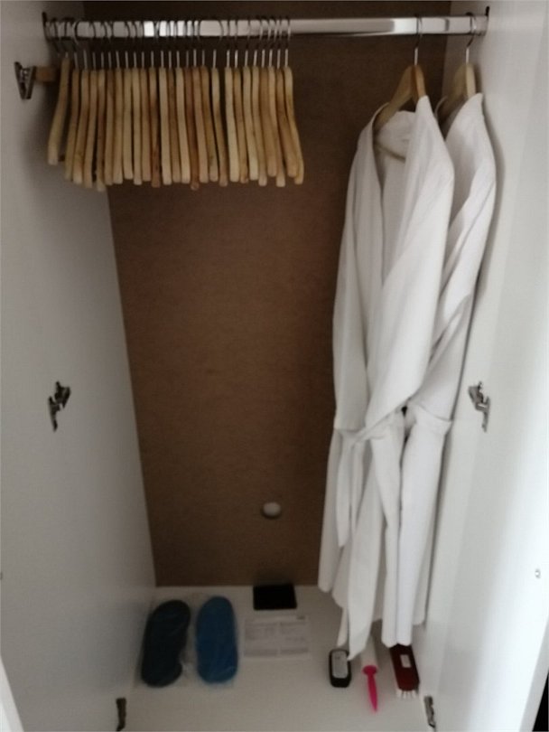 телевизор, кабельное телевидение, Wi-Fi, телефон, холодильник, светильник, фен, утюг, санузел, банные полотенца, гигиенические средства, косметические средства, двуспальная кровать, гладильная доска, стулья, шкаф для одежды, вешалки, письменный стол, багажная тумба, зеркало, мини-бар, письменные принадлежности, обслуживание номеров, информационная карта, меню, унитаз, раковина, ковровое покрытие, отопление, душ, вид на город, вид во дворВ номере