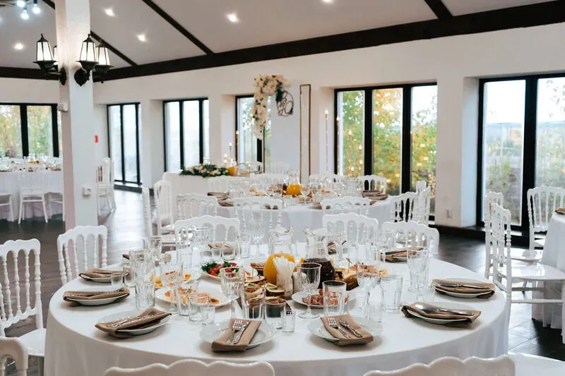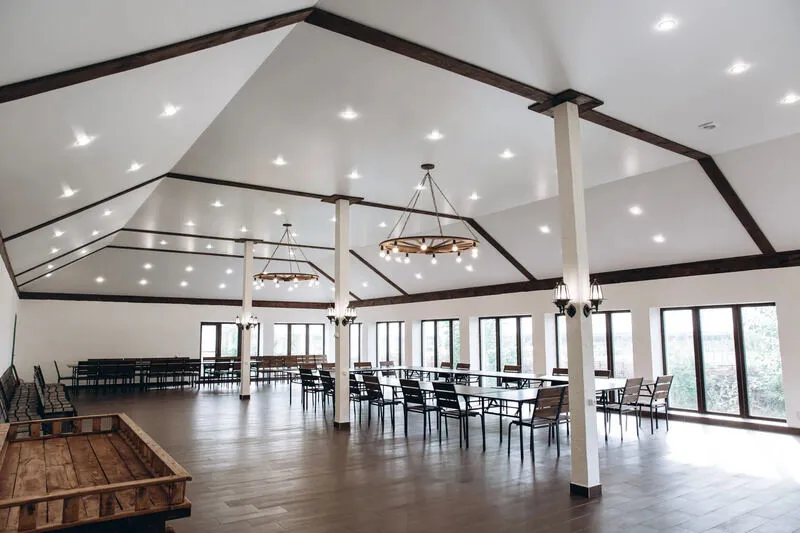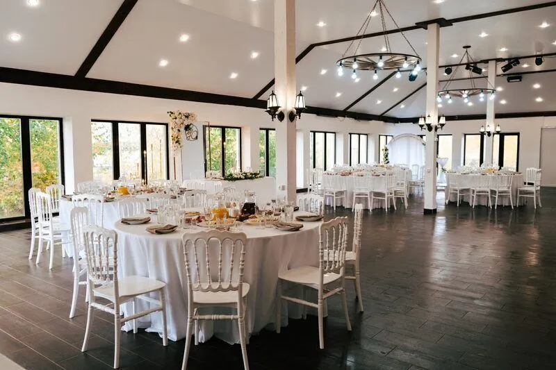 Просторный зал с витражными окнами, зона кухни, кондиционер, wi-fi, площадка для церемоний. Вместимость гостей: до 120 человек. Идеально для свадебных торжеств, юбилеев, выпускных, корпоративов, конференций.