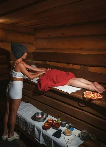 Включено 3 часа бани с чаном, а также: создание намерения на практику, солевое дыхание в парной, очищение четверговой солью, первый пар с горячими вениками, обливание на полке, чан с травами и фруктами, скатка по телу скрабом, ладка живота мёдом, второй пар с ледяными вениками, обливание молоком, саунд Хилинг под чаши, бубен и гонг.