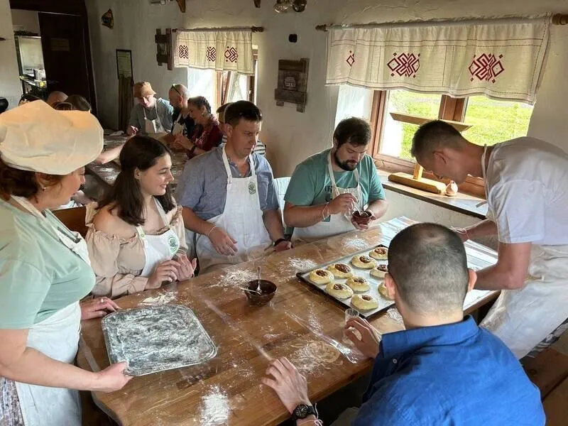 МК «Мини-пиццы в печи «Хуторские» — 650 ₽/человек. Количество участников: до 18 человек. Уровень сложности — новичок (легко). Время: 15 минут на лепку и 15-20 минут на ожидание выпечки. Участники мастер-класса готовят из теста заготовку, кладут в неё начинку по выбору и при них хозяюшка отправляет мини-пиццы выпекаться. По готовности мини-пиццы раздаются всем участникам, и они могут их попробовать.