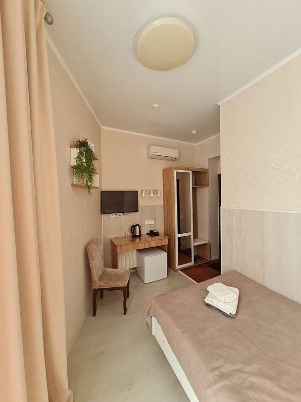Номер категории Стандарт Улучшенный "Standard "Double/Twin" отлично подходит для комфортного размещения одного, двух человек или семьи с ребенком. В номере имеется: одна двуспальная / две односпальные кровати (при запросе маленькая кроватка для ребенка), тумба, письменный стол, стул, шкаф, обувная полка и зеркало. В каждом номере предусмотрены: душ, туалет, фен, комплект полотенец, в том числе полотенце для ног, гигиенические принадлежности, тапочки. Номер оборудован: ТВ, телефоном, кондиционером, мини-холодильником, чайником и бесплатным Wi-Fi, водой бутилированной питьевой со стаканами.Услуги и удобства