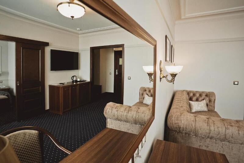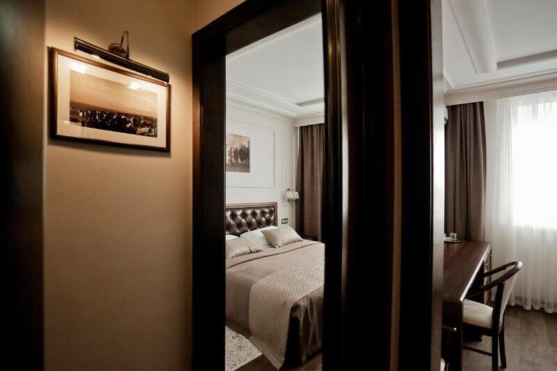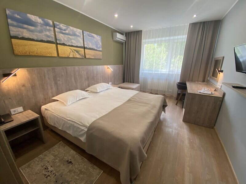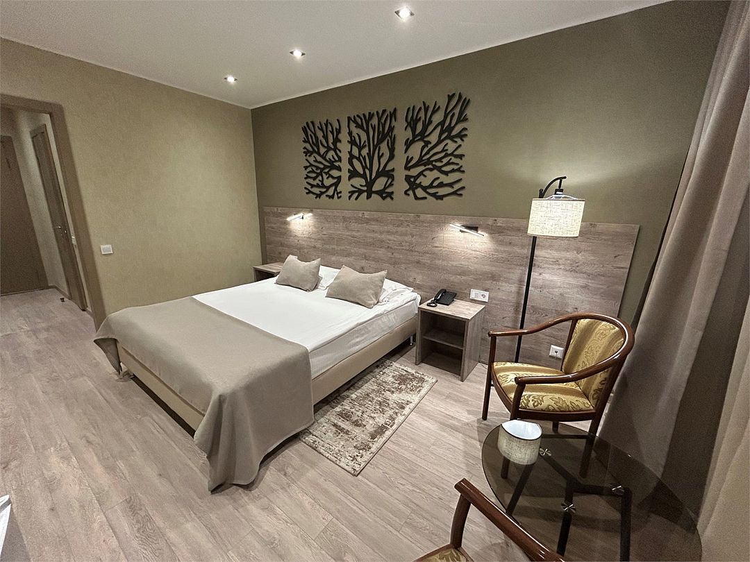 Улучшенный однокомнатный номер с двуспальной кроватью, рабочей зоной и зоной отдыха.
