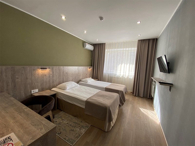 Уютный однокомнатный номер с рабочей зоной и двумя односпальными кроватями.