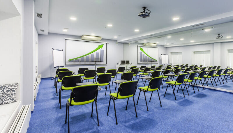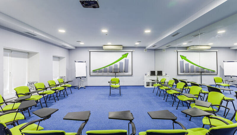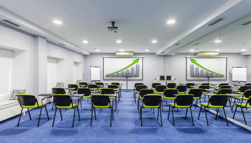 Мультимедийное оборудование — проектор, экран, телевизор для зум презентаций, флипчарт с маркерами и бумагой, демонстрационная доска, ноутбук, микрофон, лазерная указка входят в стоимость аренды.