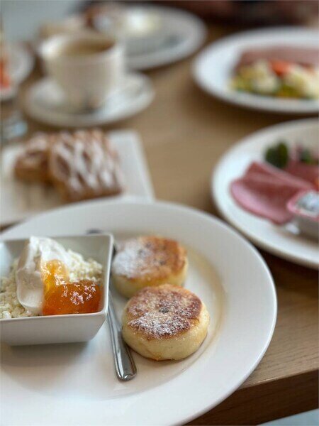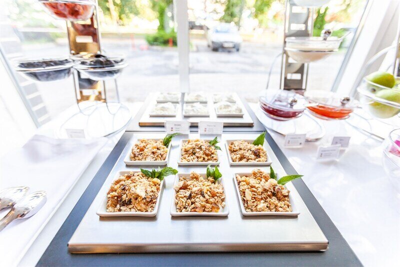 Завтрак в формате шведской линии, составлен из проверенных временем рецептов: каши, сырники, слабосоленый лосось, омлет, скрэмбл, блины, овощи, фрукты, выпечка и творожные десерты.