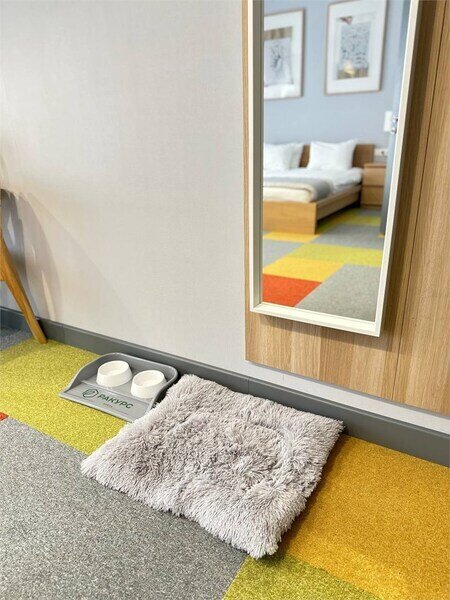 Удобства для питомцев, путешествующих вместе с хозяином. Для проживания в гостиничном номере допускаются животные ростом до 50 см и весом до 8 кг.