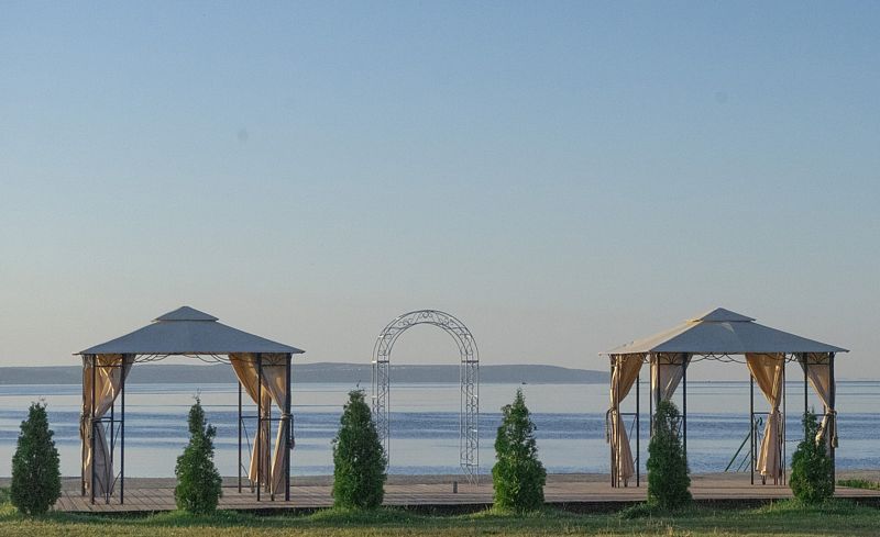В стоимость входят: гостевые дома, баня, беседки, шатры, летняя площадка (без банкетного зала).