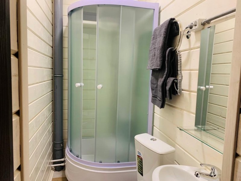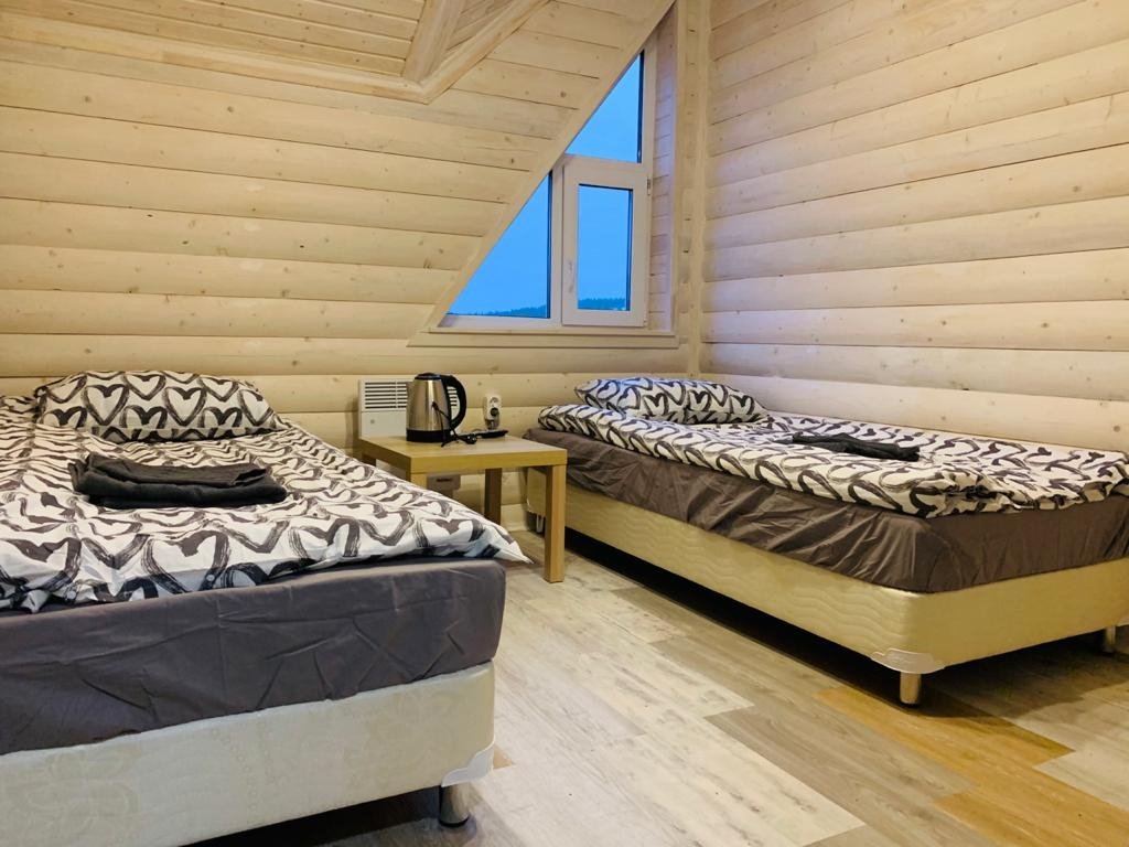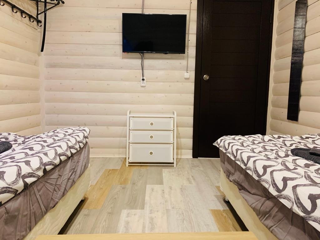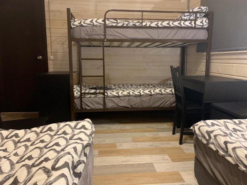 Номер с двумя односпальными кроватями и одной двухярусной кроватью. В номере находится душ и туалет. Эл. чайник и телевизор.В номере