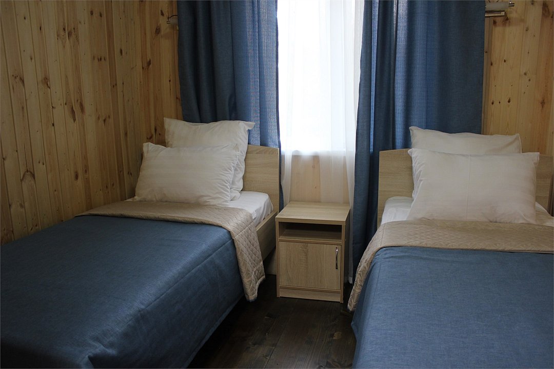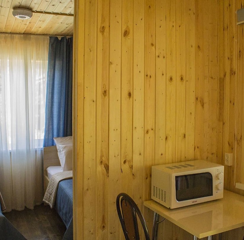Одноэтажное деревянное строение, состоящее из 4 секций, каждая из которых рассчитана максимально на 2-х человек. Каждый номер имеет отдельный вход.