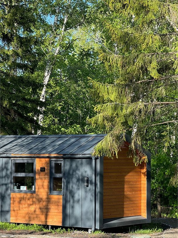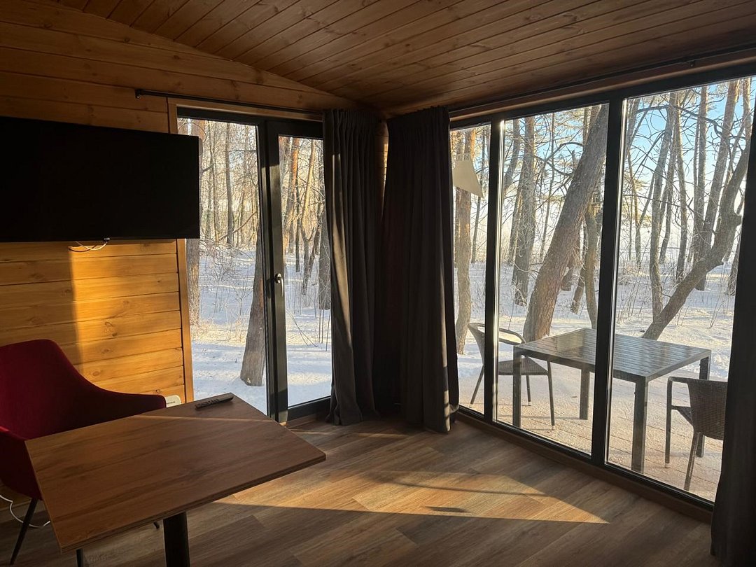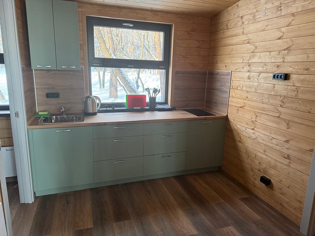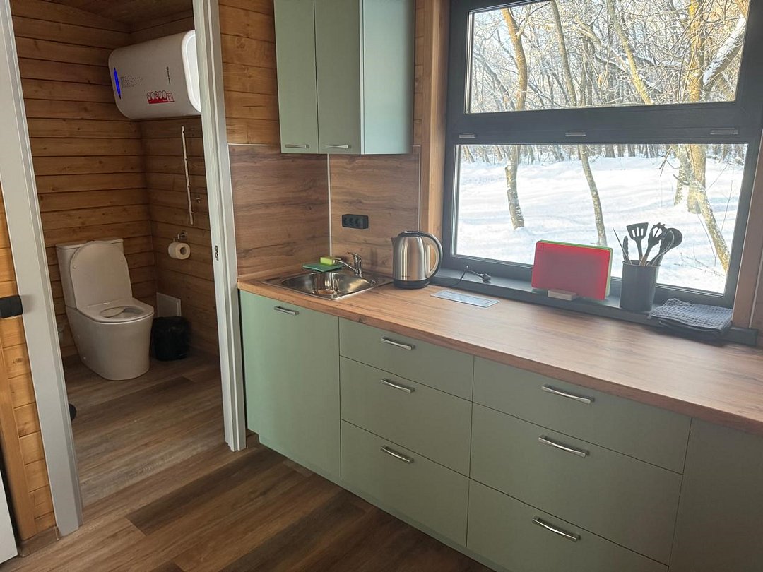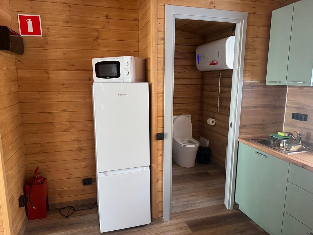 Одноэтажный дом с отдельной спальной комнатой, уютной гостиной оборудованной кухонным гарнитуром. Во всем доме панорамные окна с великолепным видом на лес. Санузел оборудован душевой кабиной, полотенцесушителем, водонагревателем. Перед домой есть мангальная зона и терраса для отдыха на свежем воздухе.