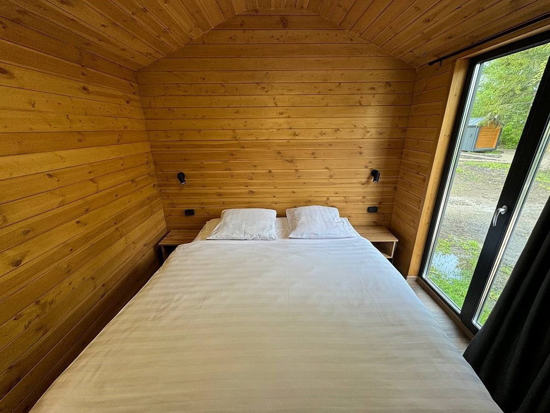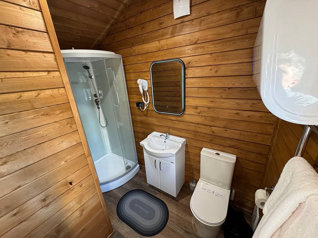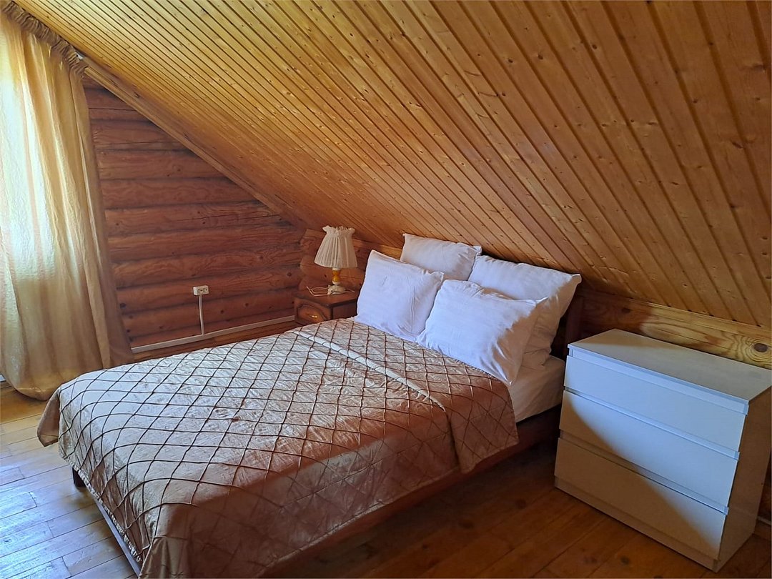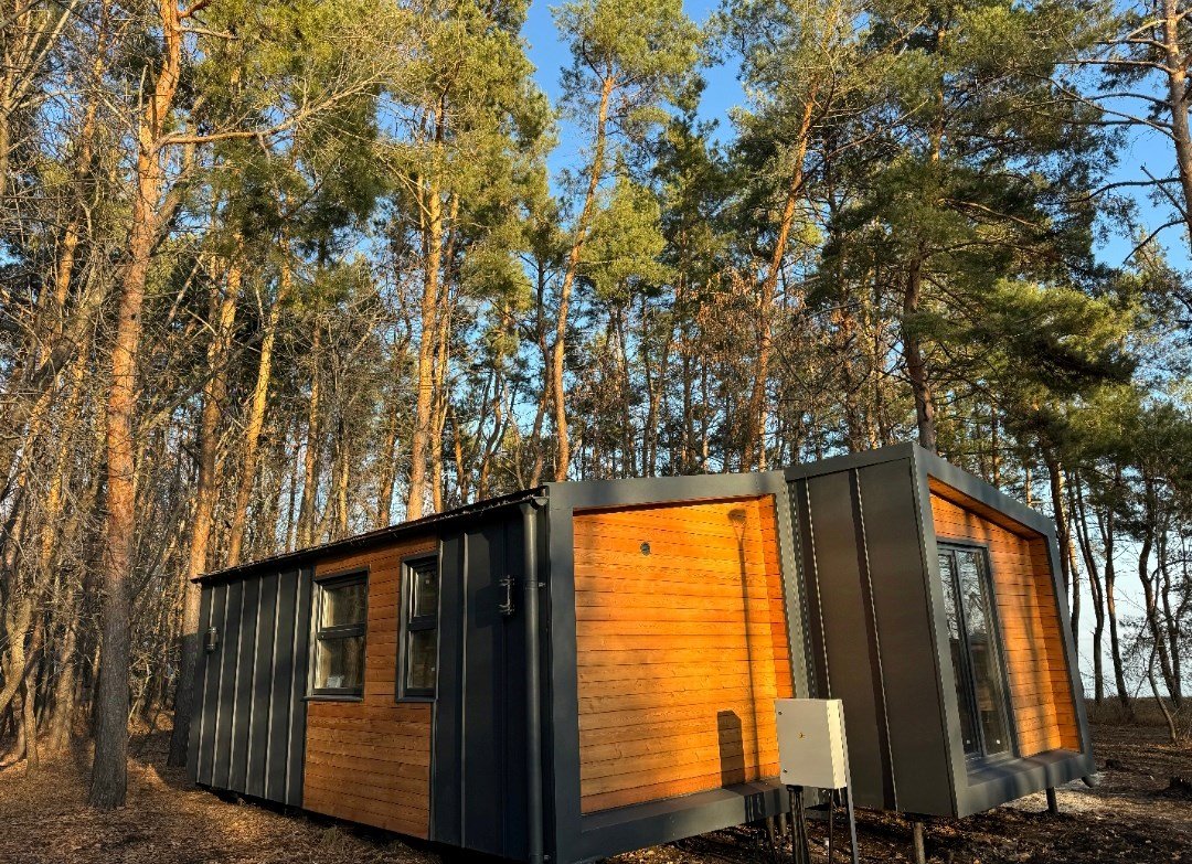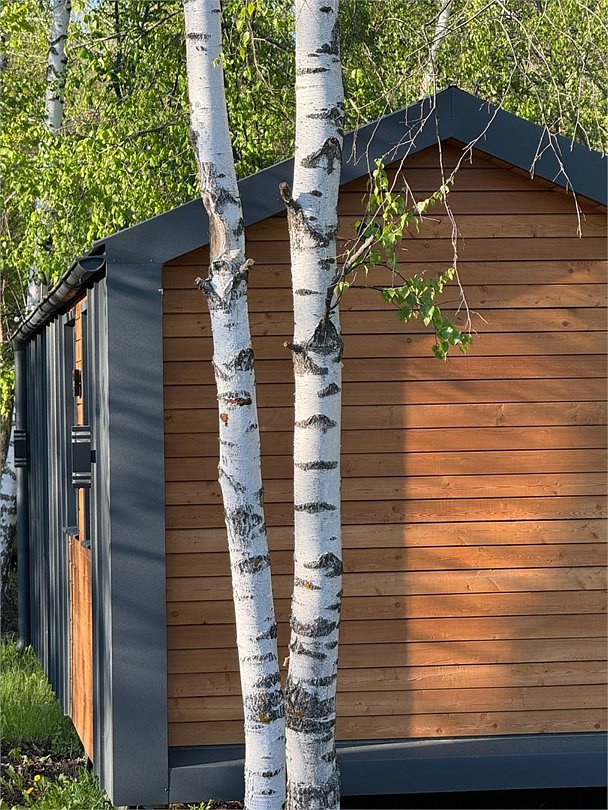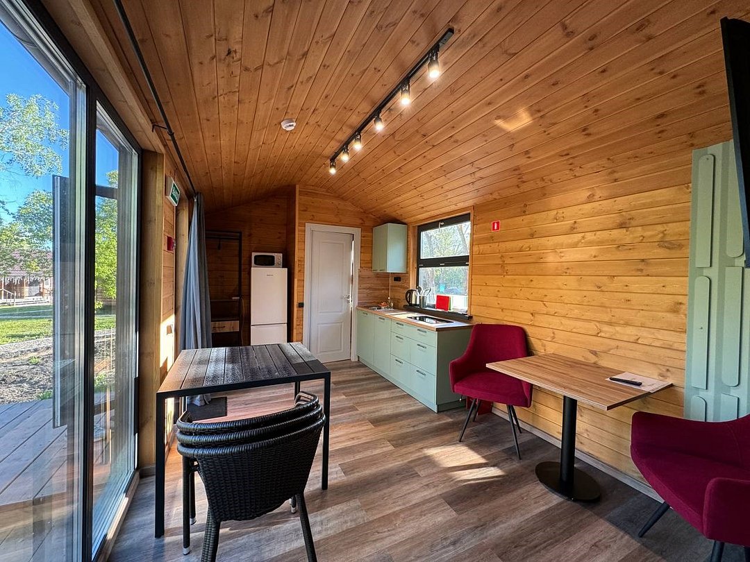 Одноэтажный дом с отдельной спальной комнатой, уютной гостиной оборудованной кухонным гарнитуром. Во всем доме панорамные окна с великолепным видом на лес. Санузел оборудован душевой кабиной, полотенцесушителем, водонагревателем. Перед домой есть мангальная зона и терраса для отдыха на свежем воздухе.