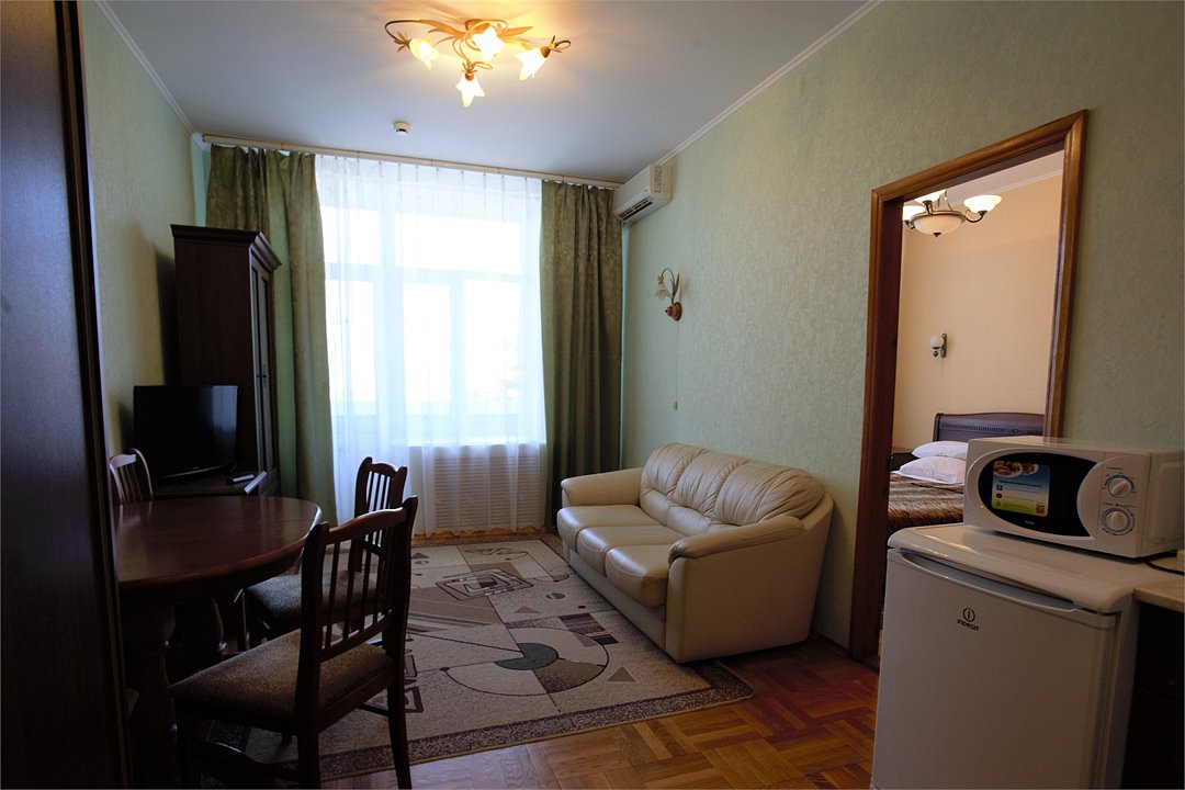 Комфортабельные номера высшей категории с современным ремонтом: уютная гостиная с диваном и спальня с двуспальной кроватью.