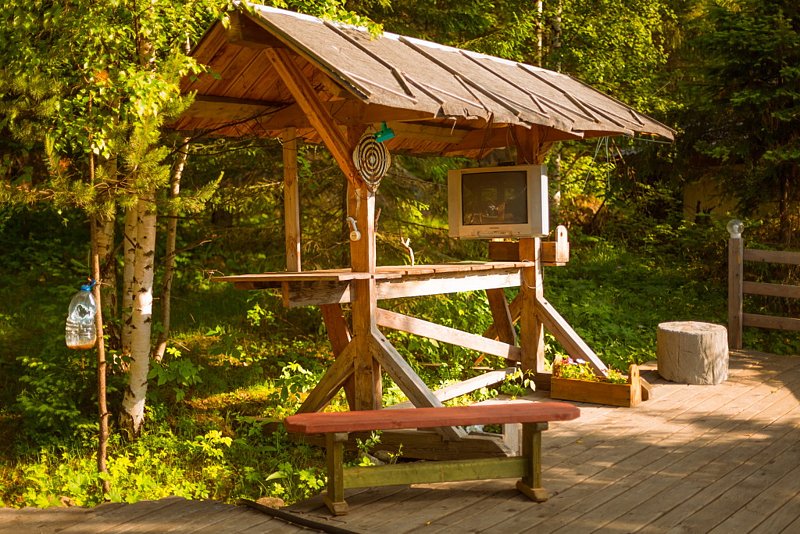 Уютный номер с частичными удобствами. В тёплом домике есть питьевая вода, постельное бельё, необходимая посуда, ТВ, СВЧ и чайник.