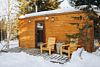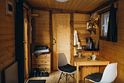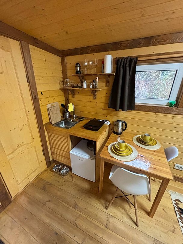 Круглогодичный теплый домик для двоих, оборудованный всем необходимым для комфортного пребывания на природе. Двуспальная кровать, обеденная зона (стол и стулья), кухня с техникой (чайник, плитка, холодильник) и посудой для приготовления и сервировки блюд. Горячий душ и уборная в доме.