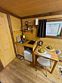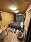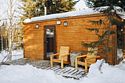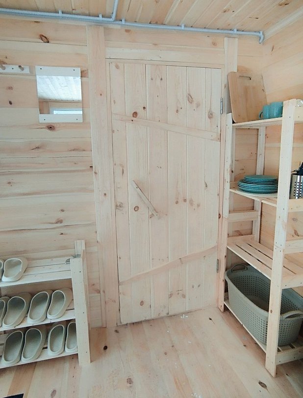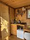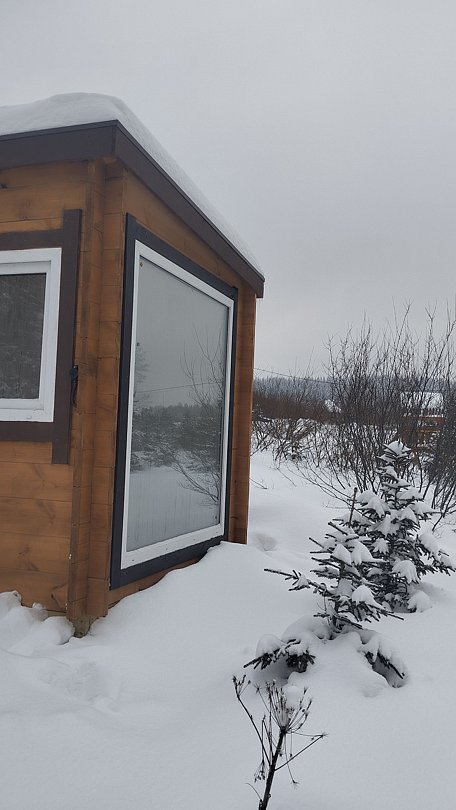 Круглогодичный теплый домик для двух взрослых и двух детей либо троих взрослых. Оборудован всем необходимым для комфортного пребывания на природе. Двуспальная кровать, раскладывающийся диван, обеденная зона (стол и стулья), кухня с техникой (чайник, плитка, холодильник) и посудой для приготовления и сервировки блюд. Горячий душ и уборная в доме.