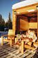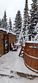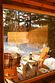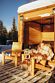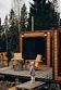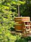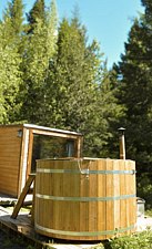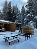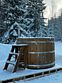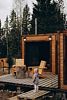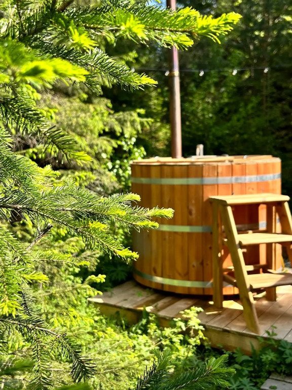 Гостей ждет горячая купель на террасе, которая создает атмосферу уюта и расслабления. Вечером она будет готова к использованию, позволяя наслаждаться теплой водой под раскидистыми елями без ограничений по времени.